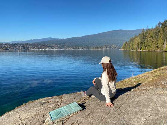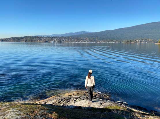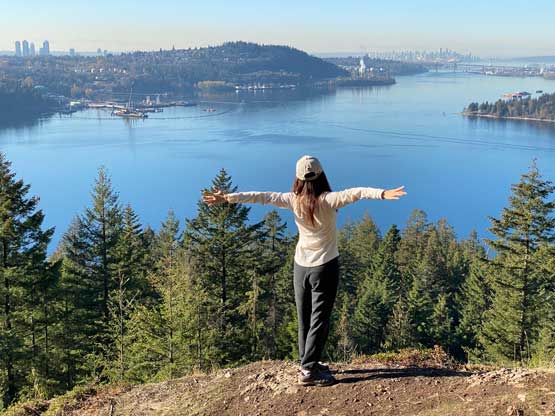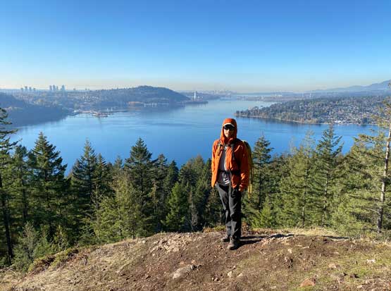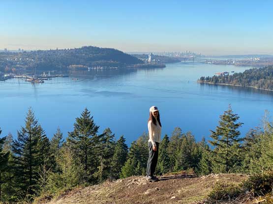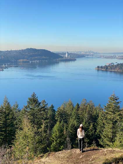 Kat at Belcarra Mtn. lookout, with Vancouver’s harbour behind
