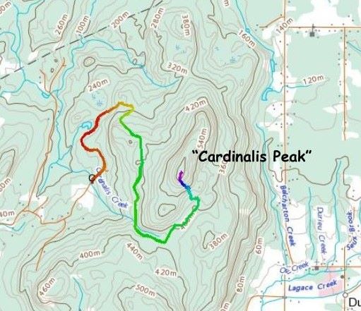 The area north of Mission in Fraser Valley is the central of SW BC’s “trash bagging”. Most, if not all of the bumps in the area are forested that offer absolutely no mountaineering interest, and yet boast over 100 m prominence. Only a few of these had earned their respective official names but most of the bumps remain unnamed or unofficially-named. “Cardinalis Peak” isn’t an exception. This is one of the higher and more prominent objectives in the piece of woods sandwiched between Hatzic Prairie and the lower Stave Lake, and the access is by logging roads near the village of Steelhead. Over the past few years this peak had been explored by quite a few parties and there are two routes to consider. For those without bikes the shorter but more thrashy west slopes make more sense, but I preferred the longer and more roundabout south side route as I’d be approaching on bike.