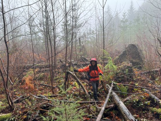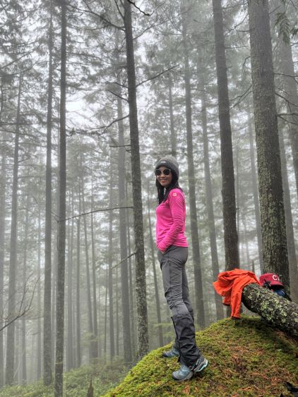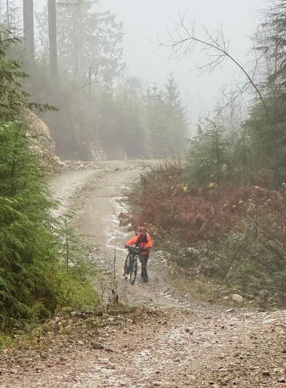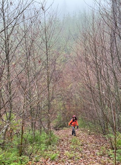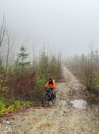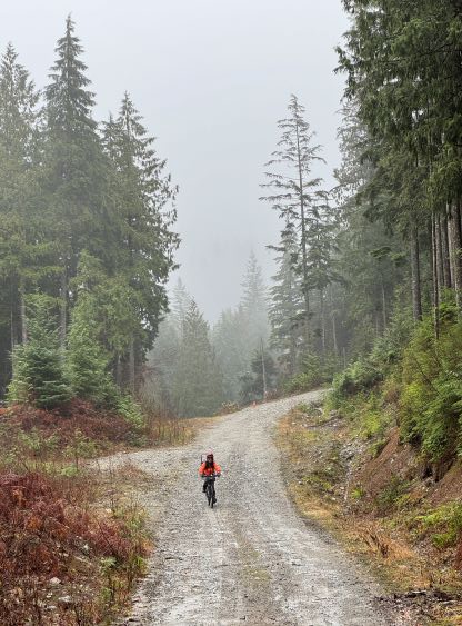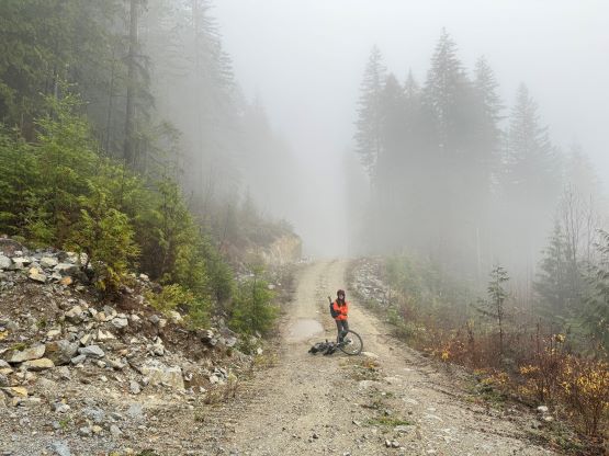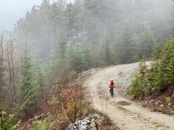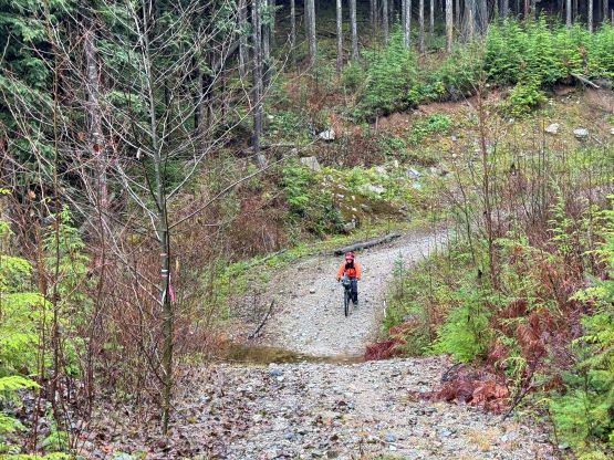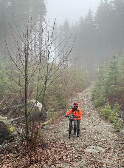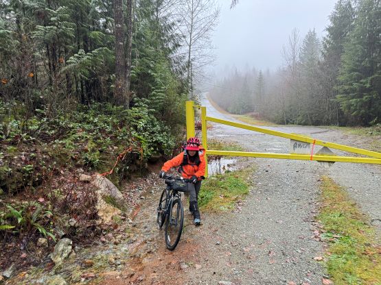 I would not waste a full day for objectives like this and in fact, I wouldn’t even bother to use a sunny morning as the summit is completely forested with no view whatsoever. The week has been quite active with a series of storms but Wednesday morning seemed to have a brief break. The forecast was calling for a tapering trend so I made the last-minute decision with Kate. We would leave White Rock at 8 am in order to start biking no later than 9:30 am. I had to be back home no later than 3:30 pm for work and I estimated the round trip to be not much more than 3 hours. It was raining when we parked in front of the gate at the start of the logging roads but I hoped it would stop soon.