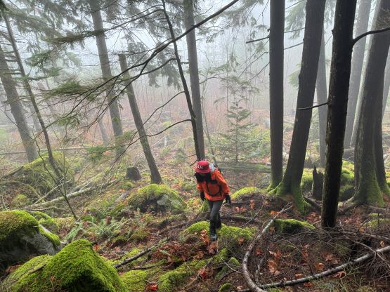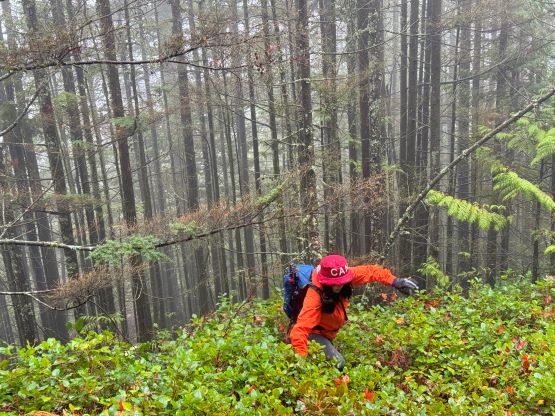 I anticipated some bad bushwhacking by reading some of the other reports but at least a few reports mentioned “not as bad as they thought”. I would tend to agree with the latter. The worst thrashing was a 10-meter band of brambles and dead-falls right at the start as the roadside is exposed to sunlight. As soon as we entered the forest the bushwhacking had become almost non-existing. There were occasional dead-falls in addition to one or two bluffs but that’s it. The slope was indeed as steep as most people made it sound like, but that’s to be expected on trips like this. We are thrashing in BC’s coast, after all. Nearing the summit we started to encounter salal and that added a little bit to the overall resistance, but the thrashing in salal wasn’t continuous. We could always link up patches of open forest. There’s no confusion about the exact location of the true summit as it’s rather obvious, but as expected, there’s no view.