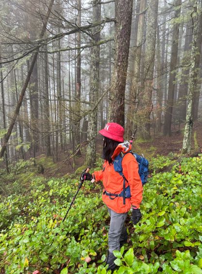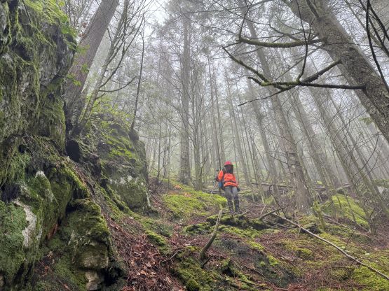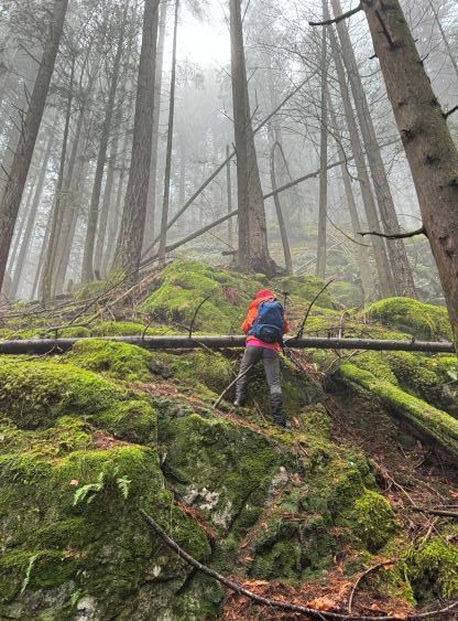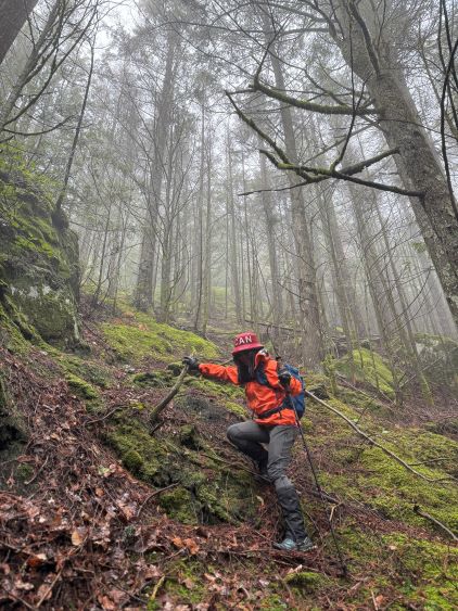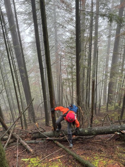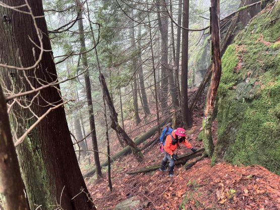 The biking portion was more difficult than I thought with numerous up-and-downs (that would be tiring on the return), and a few extremely steep sections that necessitated pushing even for me. Kate’s bike still costs over a thousand dollars so it’s not the usual cheap shit that I observed from most of my other friends, but Kate’s bike isn’t built for riding on rough terrain. As a result she was still suffering a lot trying to keep up with me, which was not to my surprise. There’s at least 50 m elevation loss from the point where the two routes diverge to wrap around the south side of the peak, and the FSRs were becoming increasingly rough and overgrown. The final kilometer was so rough that I called Kate to ditch her bike, whereas I stubbornly pushed my bike further, on mostly rocks while dodging the alder branches. I knew I could ride down this kind of stuffs (slowly with care) so I might as well make the most use of the fatbike. There’s no point in following the road to the very end as the south-east side of the summit offers the more direct attack, so I ditched the bike about 200 m from the road’s end, and then we dived into the forest.