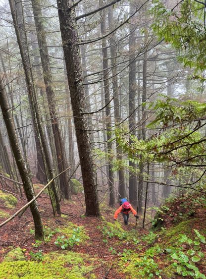 The biking portion was more difficult than I thought with numerous up-and-downs (that would be tiring on the return), and a few extremely steep sections that necessitated pushing even for me. Kate’s bike still costs over a thousand dollars so it’s not the usual cheap shit that I observed from most of my other friends, but Kate’s bike isn’t built for riding on rough terrain. As a result she was still suffering a lot trying to keep up with me, which was not to my surprise. There’s at least 50 m elevation loss from the point where the two routes diverge to wrap around the south side of the peak, and the FSRs were becoming increasingly rough and overgrown. The final kilometer was so rough that I called Kate to ditch her bike, whereas I stubbornly pushed my bike further, on mostly rocks while dodging the alder branches. I knew I could ride down this kind of stuffs (slowly with care) so I might as well make the most use of the fatbike. There’s no point in following the road to the very end as the south-east side of the summit offers the more direct attack, so I ditched the bike about 200 m from the road’s end, and then we dived into the forest.