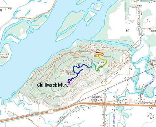 Chilliwack Mountain is a small, but isolated forested hill in the middle of Fraser Valley that boasts absolutely zero mountaineering interest, but as a peak-bagger I had no excuse but to pay some effort to stand on its summit. The required effort is literally nothing because a pave road goes almost to the top, and in fact, most of the “mountain” has been turned into urban areas. The very top of Chilliwack Mtn. is reserved for the natural status thank to the built of Hillkeep Regional Park. From the uppermost parking lot a short trail brings local hikers to a “viewpoint” and from there it’s a very short bushwhack to the summit. The summit is heavily forested.