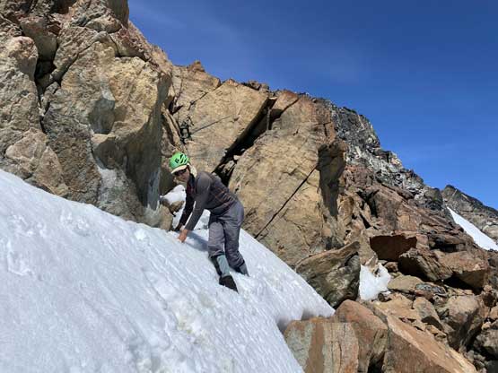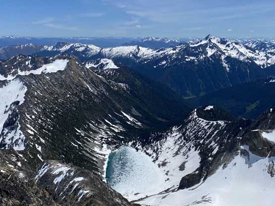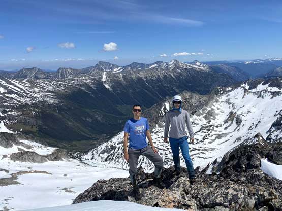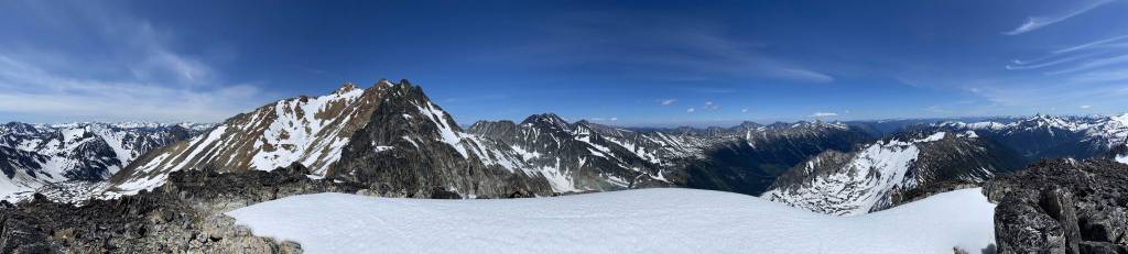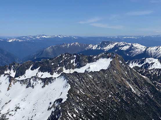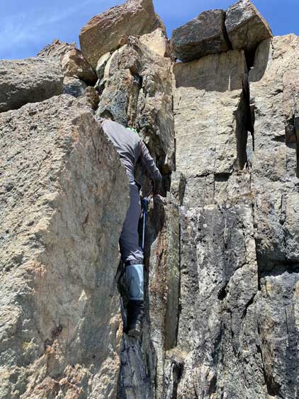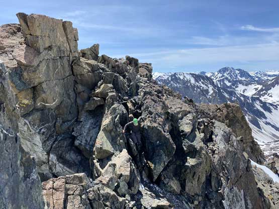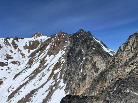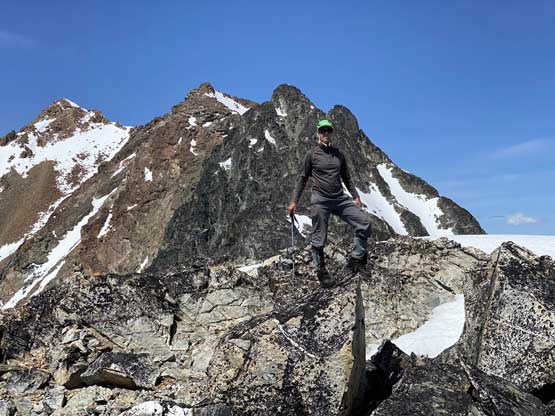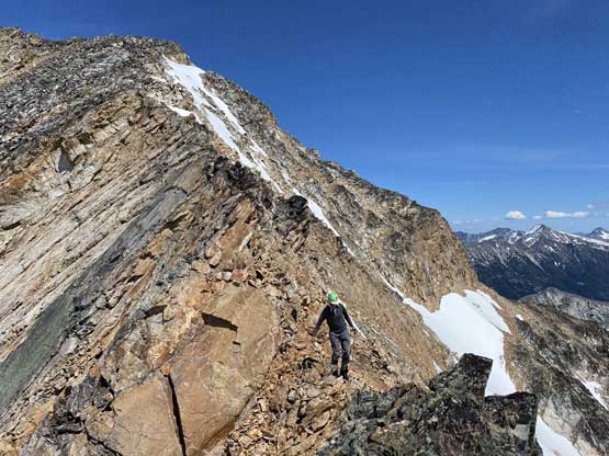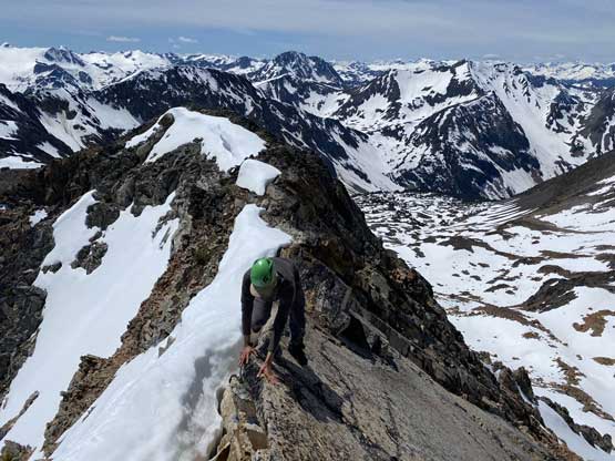 Vlad and I ditched backpacks at the col because we figured the ascent would be short enough that nothing was needed. We firstly utilized snow patches to traverse/ascend climber’s right side of the ridge crest hoping to bypass some pinnacles but to no avail. We soon came to a dead end that forced us to scramble climber’s left back onto the SW Ridge crest. From there we had to scramble up and over or bypass slightly several pinnacles that involved mostly 3rd class scrambling on a mix of good and bad rocks. One chimney was exposed 4th class but the holds were big and solid. Above that chimney the terrain eased but we still had fair amount of narrow ridge to scramble over and the summit offered some nice views. The descent back to Antimony/Claimpost col was uneventful reversing the exact route and we were back to the col in just over an hour since we left it.