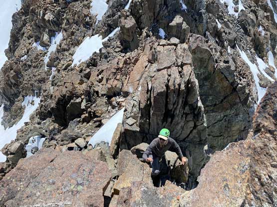 Vlad and I ditched backpacks at the col because we figured the ascent would be short enough that nothing was needed. We firstly utilized snow patches to traverse/ascend climber’s right side of the ridge crest hoping to bypass some pinnacles but to no avail. We soon came to a dead end that forced us to scramble climber’s left back onto the SW Ridge crest. From there we had to scramble up and over or bypass slightly several pinnacles that involved mostly 3rd class scrambling on a mix of good and bad rocks. One chimney was exposed 4th class but the holds were big and solid. Above that chimney the terrain eased but we still had fair amount of narrow ridge to scramble over and the summit offered some nice views. The descent back to Antimony/Claimpost col was uneventful reversing the exact route and we were back to the col in just over an hour since we left it.