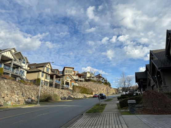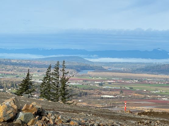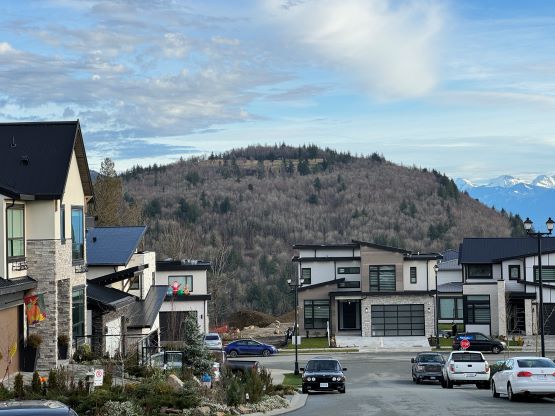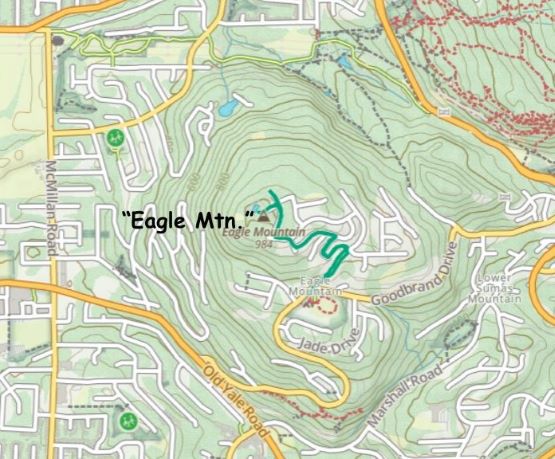 “Eagle Mountain” is the unofficial name of the smallest “P100m” bump on the lower slopes of Sumas Mountain. I had ignored it for years but it needs to be bagged somehow. The area is entirely developed for residential uses so this objective falls into the category of “urban hikes”. One can drive to basically the summit, but I wanted to at least gain some of the elevation on foot. My original plan was to park at the bottom of the hill to gain more or less the full 300 m elevation, but opted to park more than halfway up at Eagle Mountain Park due to time limitation. Cat and I did not leave White Rock until 8:30 am and we must get back no later than 11:20 am for another commitment. This return deadline did not pop up until the very last minute so I was forced to change the plan.