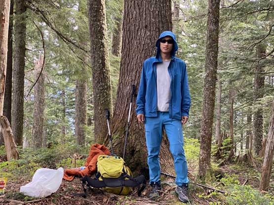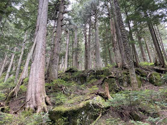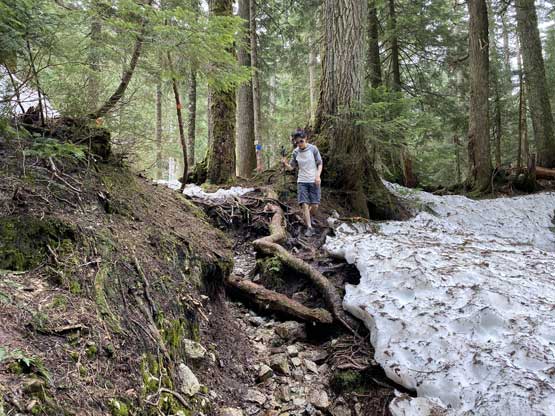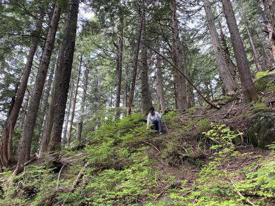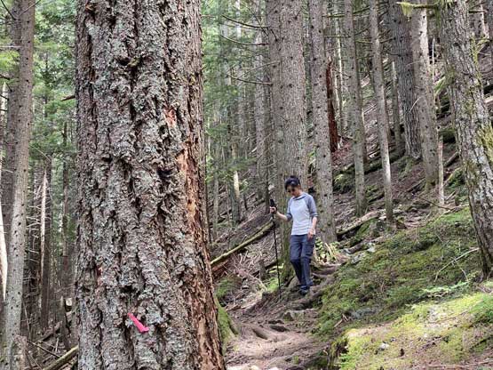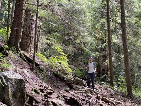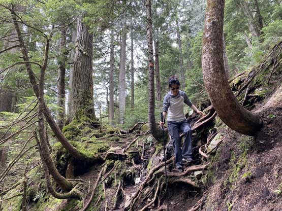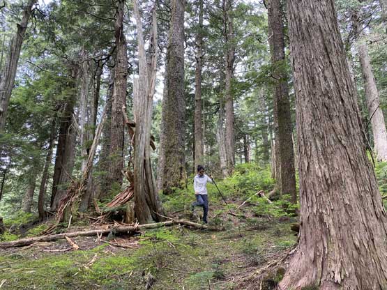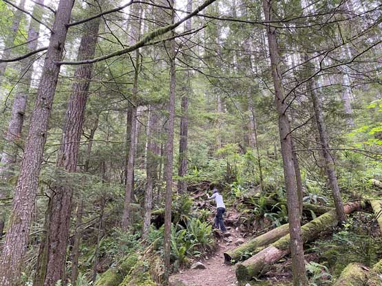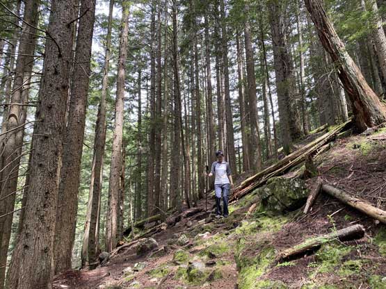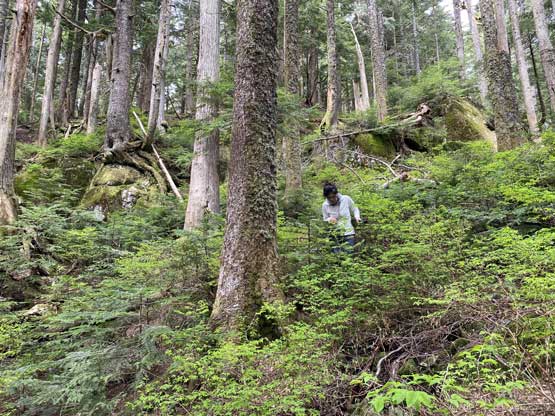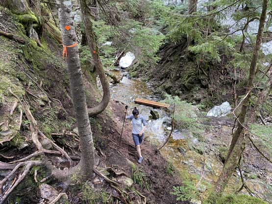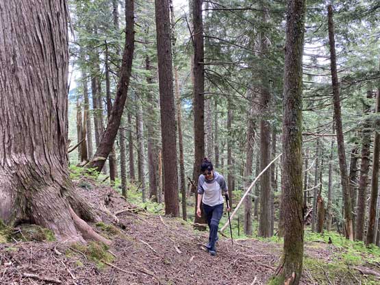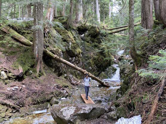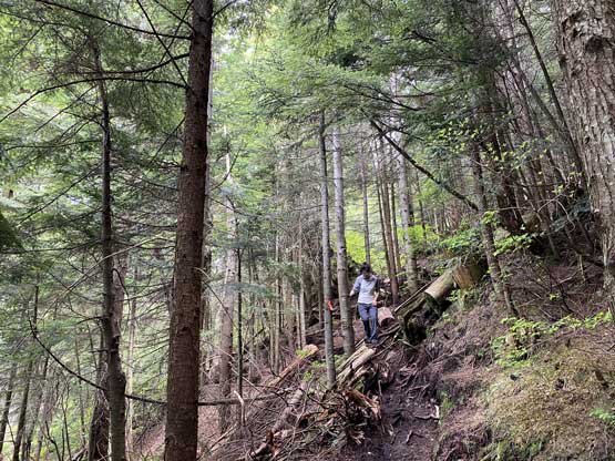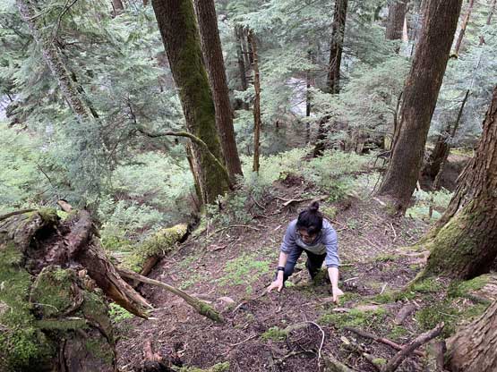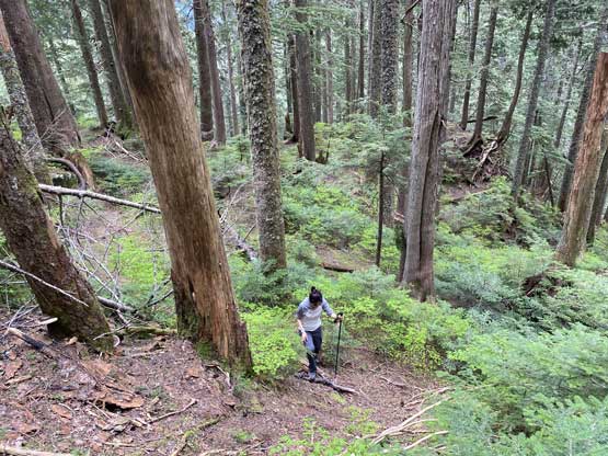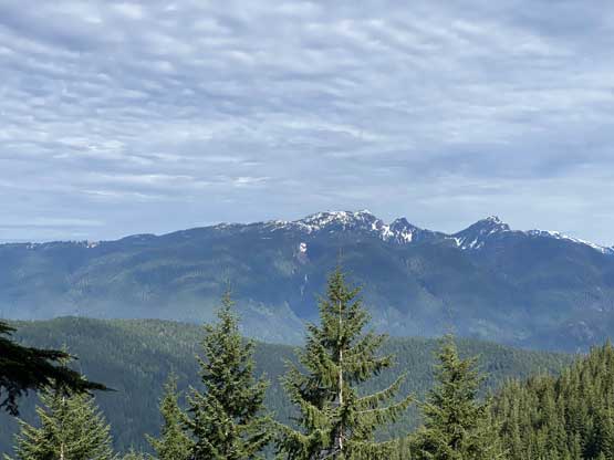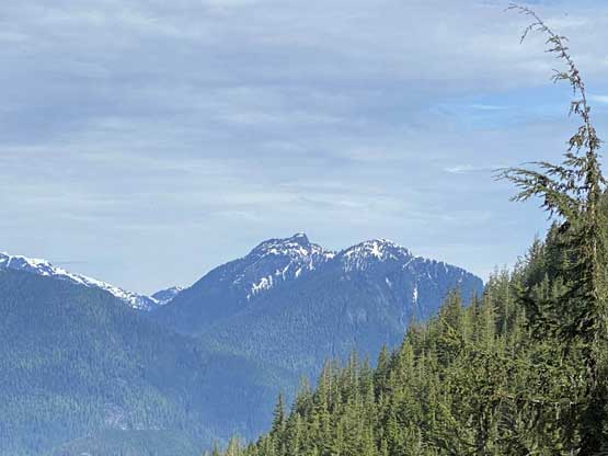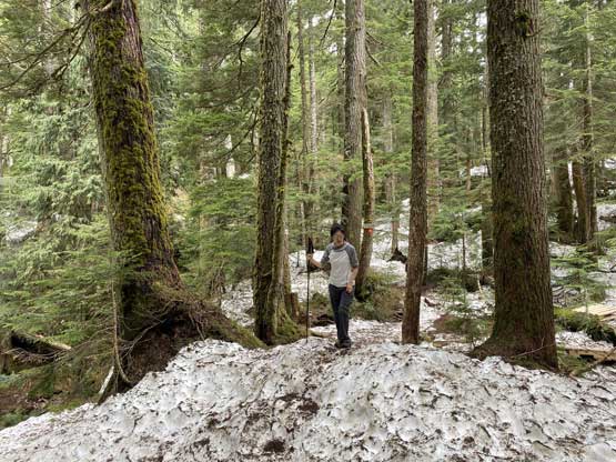 After the lookout we entered the steepest zone of this hike but by 800 m elevation the grade petered out. We then had a long rising traverse due north to the base of Eagle Mountain’s summit slopes. There were still patches of snow around the crossing of Buntzen Creek. The bushwhack to the summit via SE Slopes was mostly in old growth forest, so not bad at all. I had some concerns about this bushwhack but it turned out to be a great introductory for Kat to gain experience in this somewhat unpleasant but unavoidable part of peak-bagging.