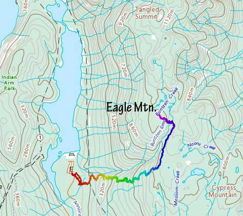 Eagle Mountain locates on the southern end of a broad wooded plateau called the “Eagle Ridge” that parallels Buntzen Lake on the east side of the lake. This is rather just a pimple with hardly any notable prominence on the ridge but is officially named. There are a maze of trails that run across the southern flanks but no trail leads the final 100 m gain to the summit. The summit itself is completely forested with no view whatsoever and that explains why nobody built a trail to the very top.