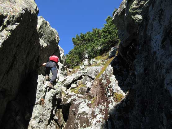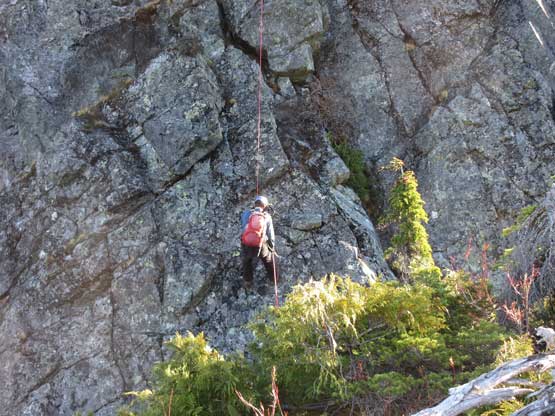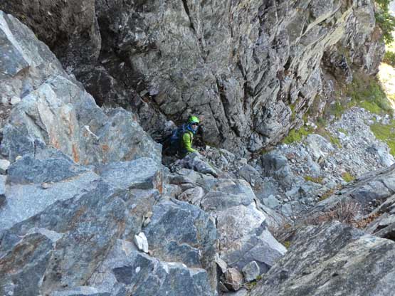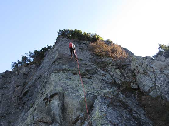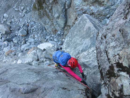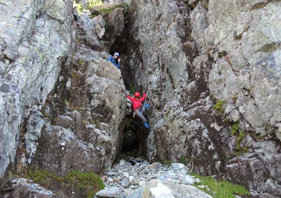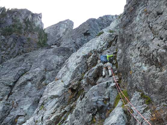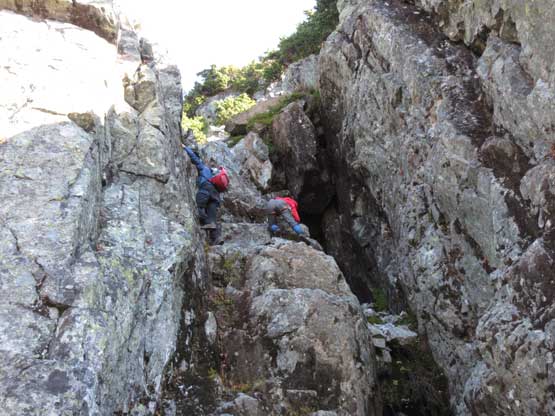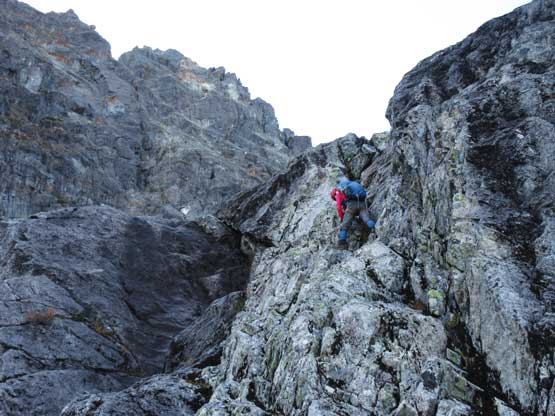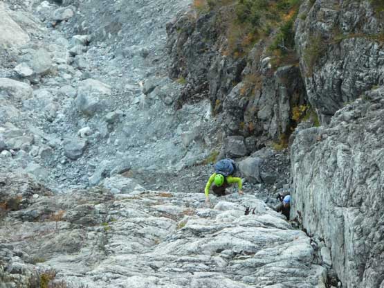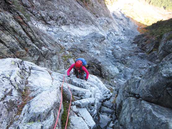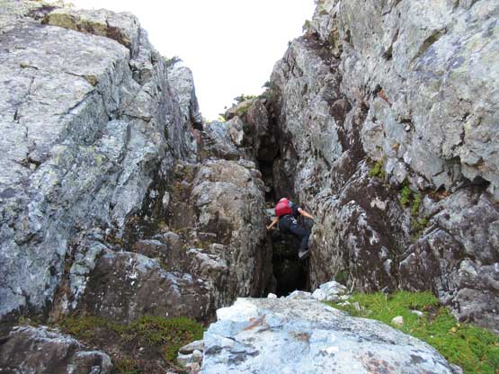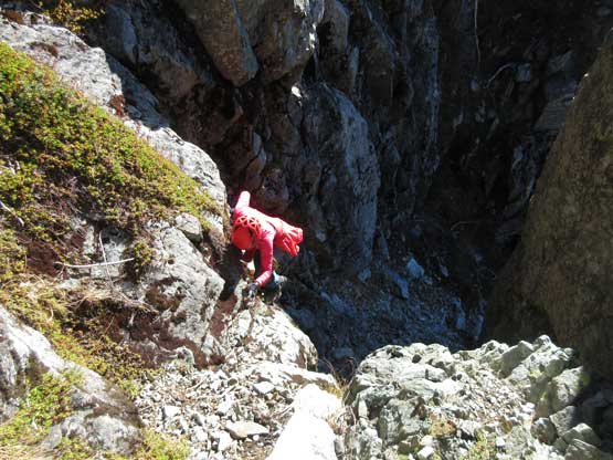 Vlad stemming up a stiff 4th class step after the crux pitch.
