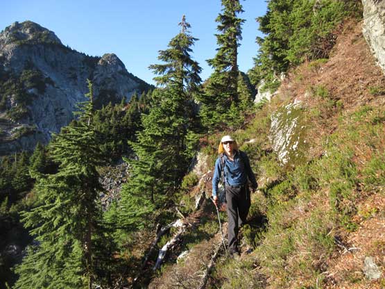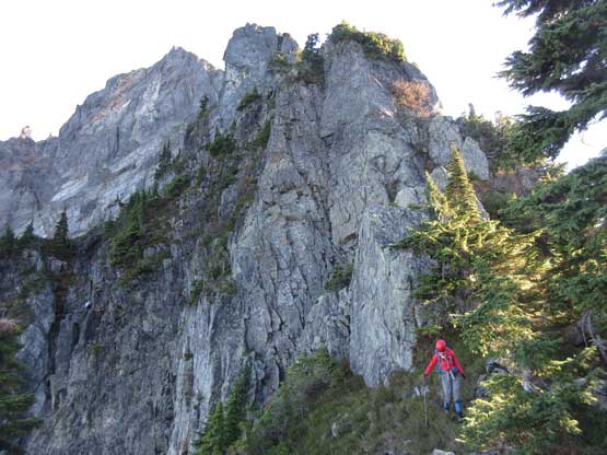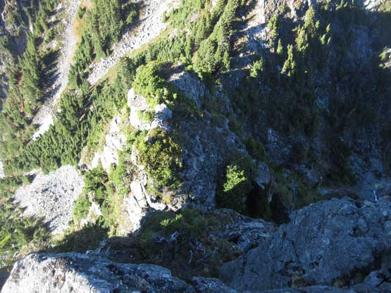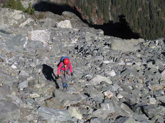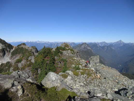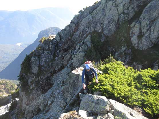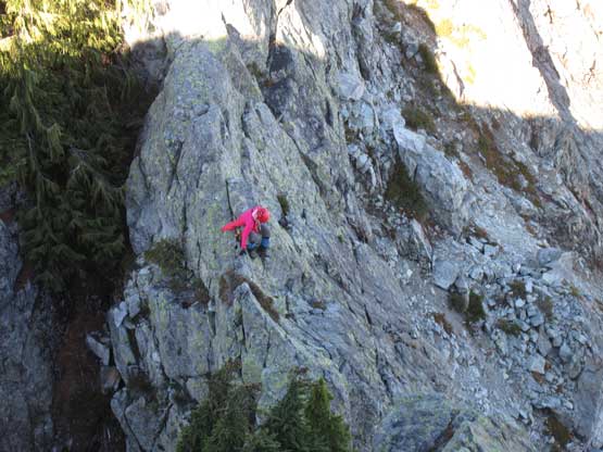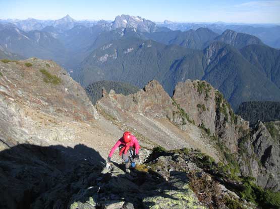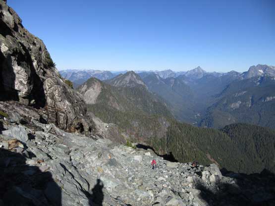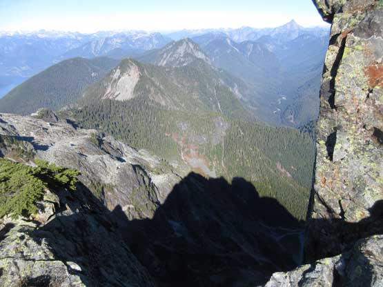 Back onto the NW Ridge proper, looking down to see the shadow of Edge Peak
