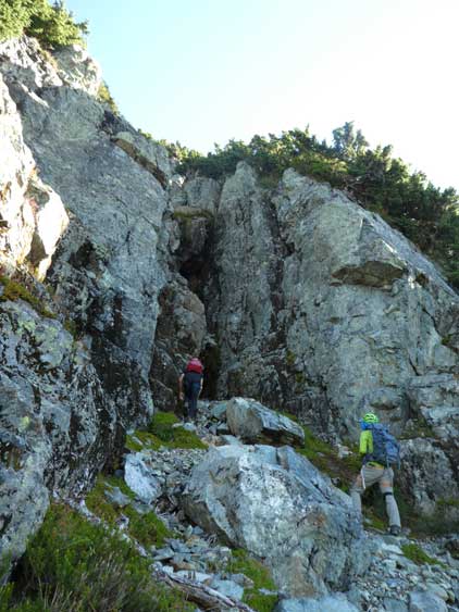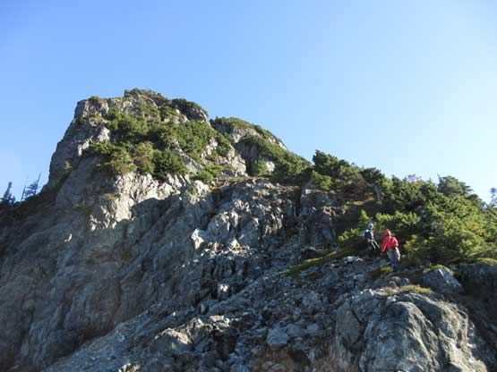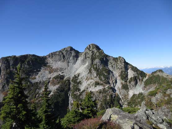 Upwards and onward we ascended steep heather slope along NW Ridge to the base of that infamous “chockstone chimney”. Vlad went ahead stemming up the middle of it while Lily and I avoided that move by climbing the left side vertical wall on blocky up-sloping face holds. Our routes merged at halfway up the chimney and the upper half still involved a few 4th class moves on face holds. Above the chimney we ascended a mix of steep heather and 3rd class rock exiting climber’s left back onto the ridge proper. The last stretch leading up to the north (false) summit was easy, but then I was surprised to see a higher (true) summit to the south.