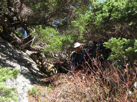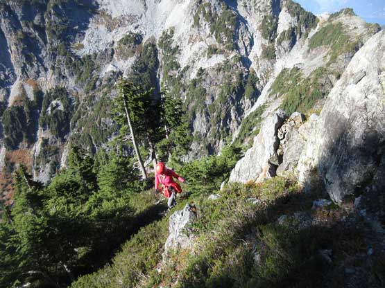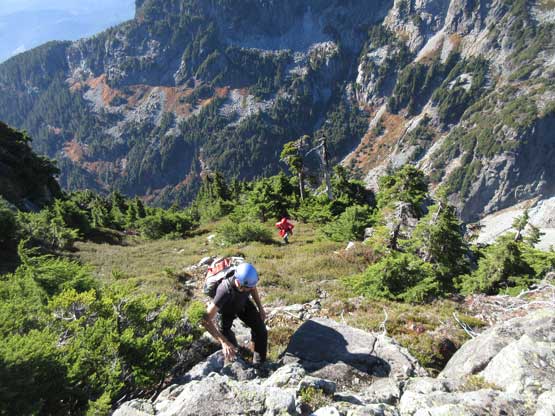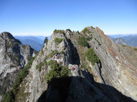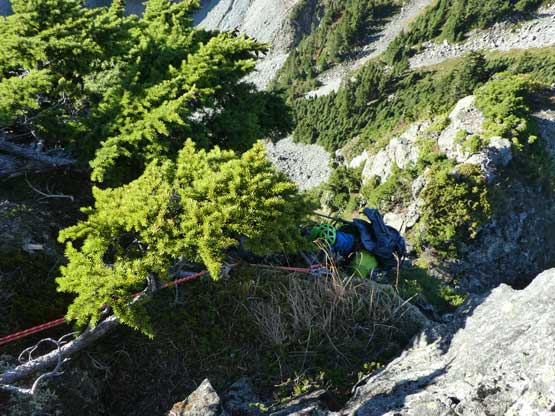The plan was to bag both Edge Peak and Golden Ears so we couldn’t afford lingering too long on this summit. After half an hour’s stay we leisurely started the traverse back to the false summit. To get down the NW Ridge we actually didn’t have to touch the cairn on that false peak but we did no nonetheless just to be sure. There’s no obvious anchor above the chockstone chimney so after a bit of discussion we just opted to down-climb, and that was pretty fun. Lower down we thrashed through some krummholz and did two consecutive 30-m rappels off the ridge’s nose. Both rappels were near vertical and the second one had a tricky start as we had to literally rappel through a batch of krummholz… But it’s manageable. The last stretch of the descent down into Edge/Golden Ears col had the worst bush thrashing but I wasn’t sure whether or not we stayed on the best route. The ridge got so dense that we had to bail down the west side in search for some open ground. That was no fun but once down, all of the difficulties’ behind.