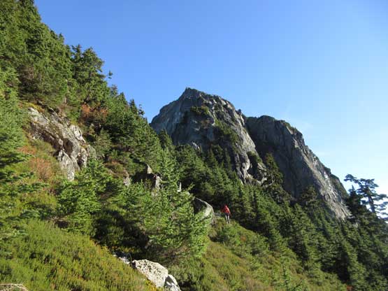 Although not the highest in the immediate vicinity the rugged spire of Edge Peak is well considered as the hardest summit in Golden Ears group. There are three known routes on this peak and some degree of rock climbing, bush thrashing and complicated route-finding is required no matter what. It seems like most parties chose to ascend via the White Dyke on NE Face and descend via a bushy traverse either northwards to Golden Ears or southwards to Blanshard Needle. The scrambling on White Dyke is reported to be “classic” and my interpretation of the difficulty is “BC 4th class” type of adventure, with generally solid holds. I had previously climbed Blanshard Needle on a separate trip but never paid a visit to the main summit of Golden Ears so the route decision was easy.