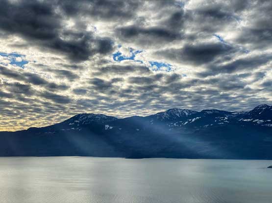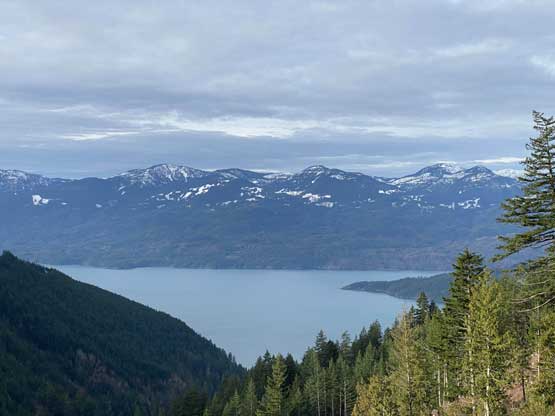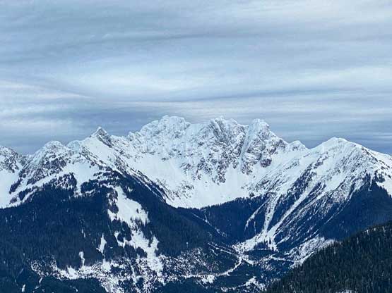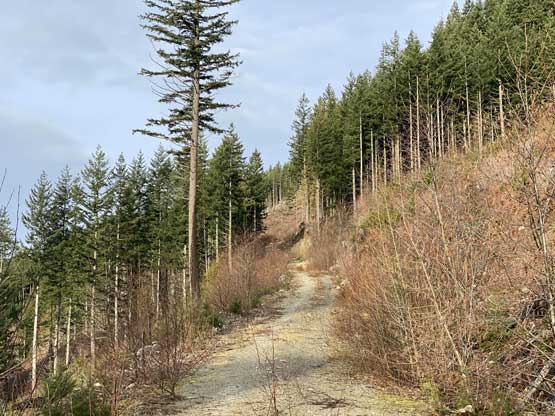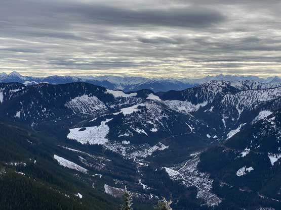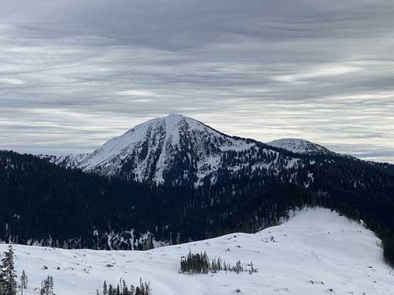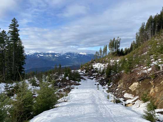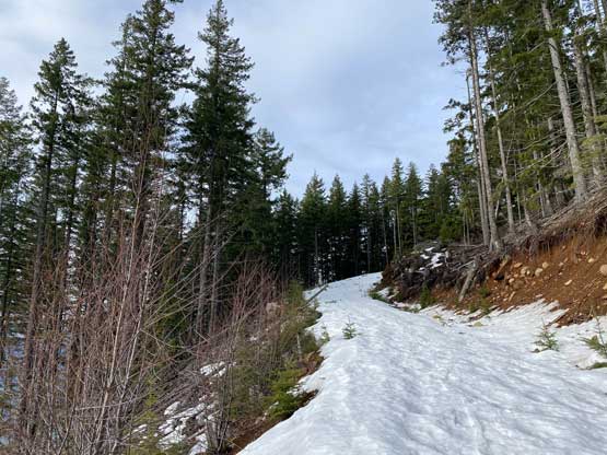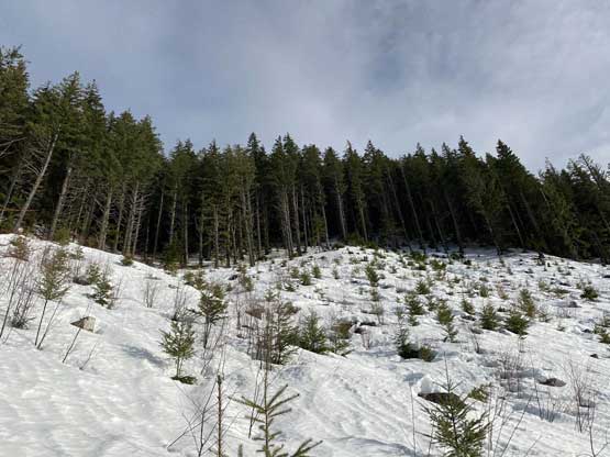 I had done enough of research about the direction of the logging roads and there really wasn’t much magic about it. I had downloaded both the Gaia topo (spur roads already on the map) and the satellite images and there’s zero excuse to get lost. After a couple kilometers and a few switchbacks I started to encounter snow at around 700 m elevation and the snow soon became continuous and I strapped the snowshoes on. The weather was more overcast than anticipated but the cloud layer was pretty high. I snowshoed to the highest point on this road at around 960 m elevation and left the road into a massive cut-block. I had the option to use mature forest at this stage versus the cut-block and chose the latter. I’m sure the mature forest would be easier to ascend but I liked the open terrain in the cut-block for views. The snow condition was kinda shitty in the cut-block though and I frequently discovered weak spots sinking knee+ deep into the wet cement. The cut-block was also steep enough to slide in the right conditions but on this particular day the snowpack depth was not thick enough to impose avalanche concern.