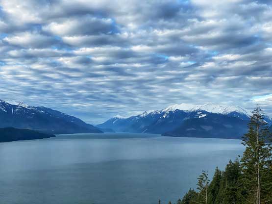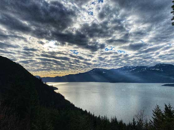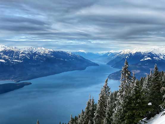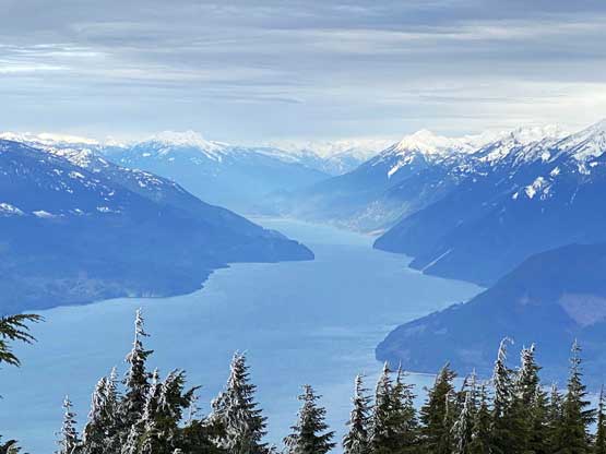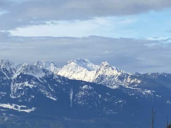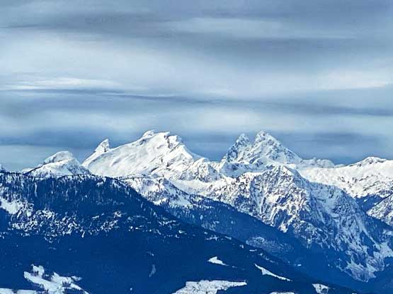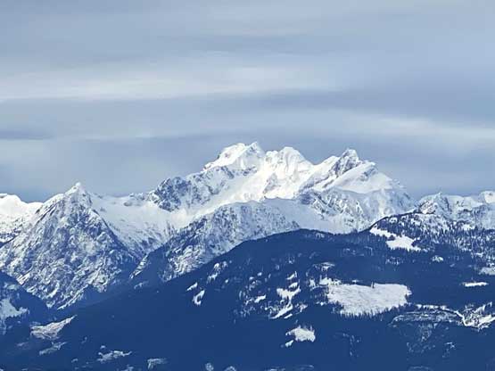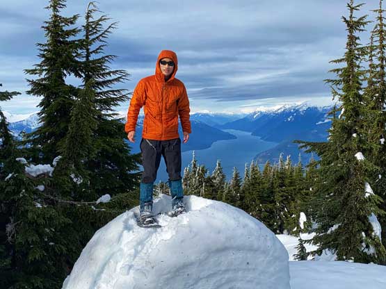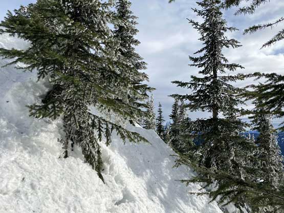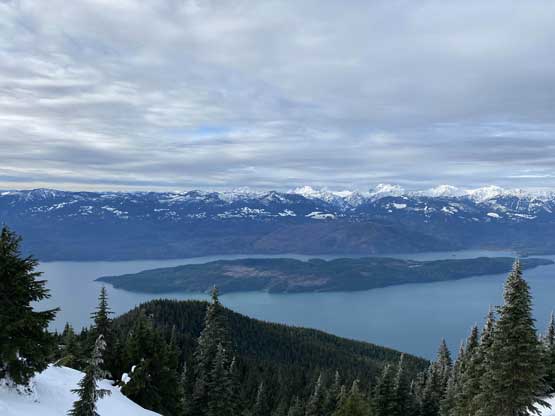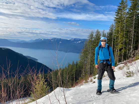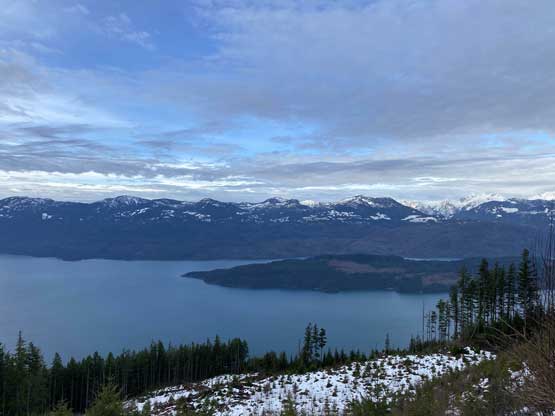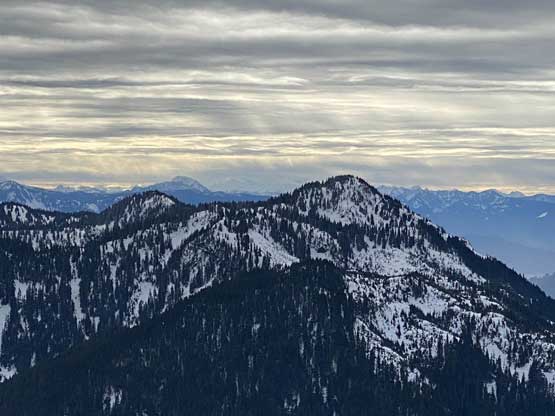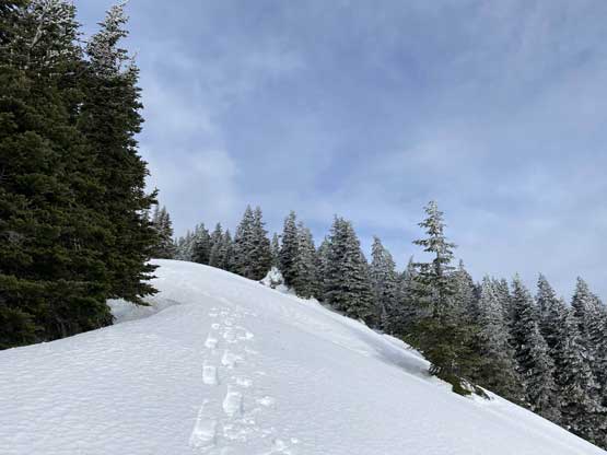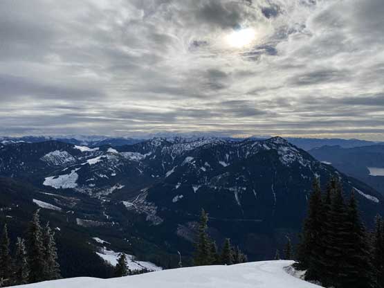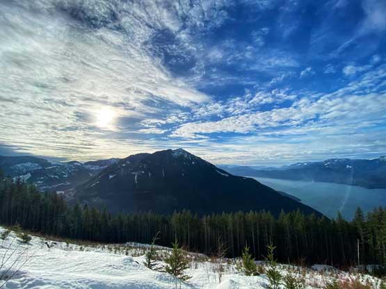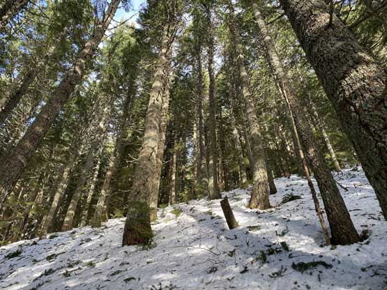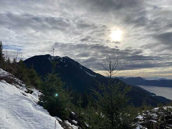 After the while the cut-block gave way to mature forest and the next 200 m elevation gain was very steep (35-40 degrees). The snow condition was icy and firm in the forest and definitely put my Lightning Ascents in test. I did manage to ascend through the steepest zone without taking the snowshoes off. At one point I considered swapping snowshoes for ice axe and crampons (I brought them knowing the conditions could be icy) but didn’t end up making the transition. Above 1200 m the grade eased and the snow condition started to become wet and saturated cement that was not supportive enough for my weight. My progress was pretty slow for a while. The ascent on the west-ish ridge above 1400 m had a few more steep and tight spots. The true summit was mostly forested but I already got the views I wanted from various viewpoints along the way.