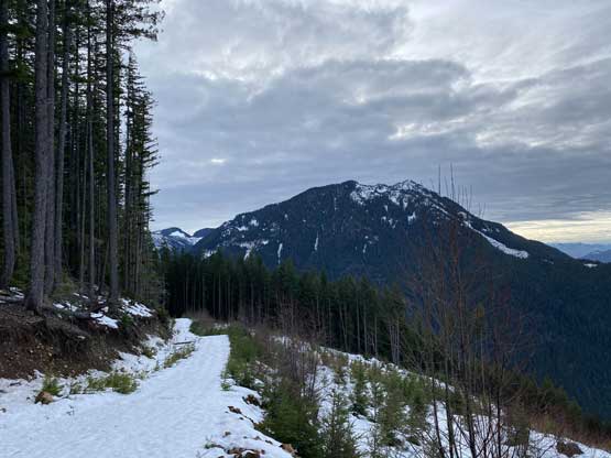 I had done enough of research about the direction of the logging roads and there really wasn’t much magic about it. I had downloaded both the Gaia topo (spur roads already on the map) and the satellite images and there’s zero excuse to get lost. After a couple kilometers and a few switchbacks I started to encounter snow at around 700 m elevation and the snow soon became continuous and I strapped the snowshoes on. The weather was more overcast than anticipated but the cloud layer was pretty high. I snowshoed to the highest point on this road at around 960 m elevation and left the road into a massive cut-block. I had the option to use mature forest at this stage versus the cut-block and chose the latter. I’m sure the mature forest would be easier to ascend but I liked the open terrain in the cut-block for views. The snow condition was kinda shitty in the cut-block though and I frequently discovered weak spots sinking knee+ deep into the wet cement. The cut-block was also steep enough to slide in the right conditions but on this particular day the snowpack depth was not thick enough to impose avalanche concern.