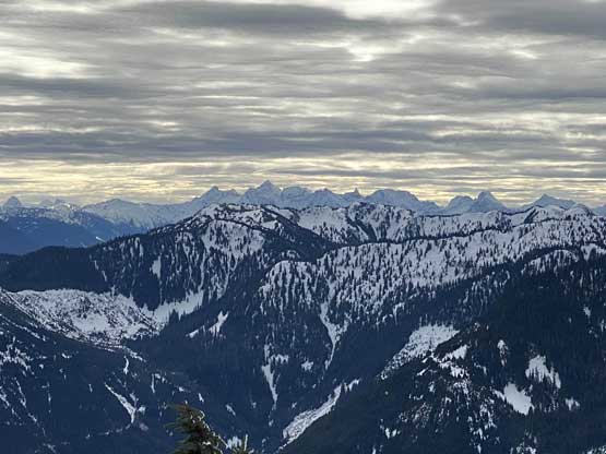 After the while the cut-block gave way to mature forest and the next 200 m elevation gain was very steep (35-40 degrees). The snow condition was icy and firm in the forest and definitely put my Lightning Ascents in test. I did manage to ascend through the steepest zone without taking the snowshoes off. At one point I considered swapping snowshoes for ice axe and crampons (I brought them knowing the conditions could be icy) but didn’t end up making the transition. Above 1200 m the grade eased and the snow condition started to become wet and saturated cement that was not supportive enough for my weight. My progress was pretty slow for a while. The ascent on the west-ish ridge above 1400 m had a few more steep and tight spots. The true summit was mostly forested but I already got the views I wanted from various viewpoints along the way.