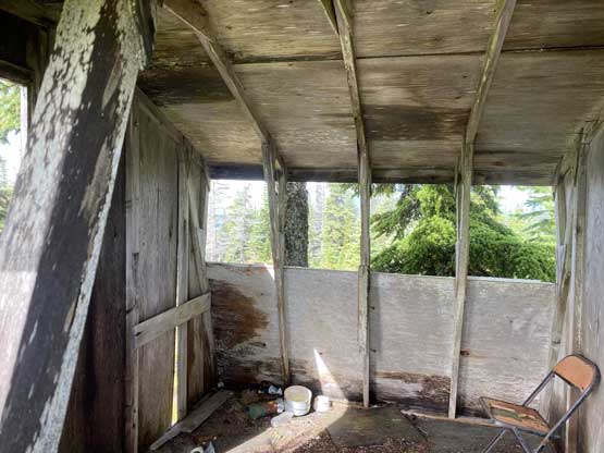 We got confused again immediately after that “viewpoint” but the GPS directed us back on track. The trail seemed to detour a ways climber’s right of the ridge/plateau but wasn’t too difficult to follow, at least for this section. The trail then joined the uppermost piece of an old and overgrown logging road and we followed the road to its very end. The trail beyond that old road stretch was still overgrown and confusing that we got further soaked and also lost the trail several times. It was downright miserable. At one point the trail no longer followed the ridge crest and instead, made a traverse to the east side of the undulating ridge crest and onto more micro-terrain and up-and-downs. The ridge seemed to drag on forever that my mind and body had both gone numb. On the last stretch to the summit we lost the trail again and just took a bushy route. The first thing I did when reaching the summit was to take my soaked shirt off. I unfortunately did not bring a dry shirt to change, but at least I had a rain jacket to keep me (sort of) warm. The sun did show up but the fogs didn’t quite lift to reveal distant views. I ended up shivering for at least half an hour before regaining some strength through eating food and drinking water.