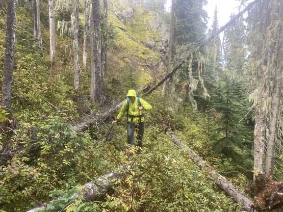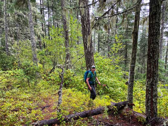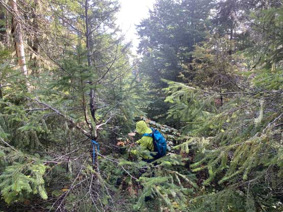 Locating the start of this trail was the first crux of this hike. This wasn’t that difficult nowadays with the GPS technology but I could see how difficult it was in the old days. The trail literally started at a spot that none of us expected it to start at, and the initial stretch was very faint. Asides the GPS track our only assurance was the occasional flags. The trail condition improved once we entered the mature forest, but only lasted for a couple hundred meters of gain. We lost the trail in a jungle mess just under 600 m elevation and were forced to bushwhack straight up. The vegetation was extremely damp with liquids weighing down the leaves that we were soaked to the bone in no time. I wore my snow pants and still got soaked to the bone. Once we regained the “trail” we still had to deal with a decent amount of “on-trail bushwhack” as well as confusing route-finding. Eventually we came to a junction with a “campsite trail” and turned left. The “viewpoint” was reached shortly after, but thank to the fog we couldn’t see a damn single thing.