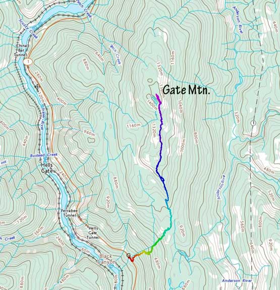“Gate Mountain” is the unofficial name of a rounded summit that rises abruptly above the Hell’s Gate not far from Boston Bar in Fraser Canyon. This peak offers some neat mid-elevation views of the canyon, but the peak itself is dull and forested that raises very little mountaineering interest. There is a “trail” that goes all the way to the summit from the highway, but the status has become very overgrown and difficult to follow in the recent years. It’s essentially a bushwhack now but with a path and flags here and there to mark the route. The abandoned status is very unfortunate as this trail apparently has some history and is included in Stephen Hui’s 103 Hikes in SW British Columbia. Another fact about this peak that attracts peak-baggers is the prominence. It’s a “P2K” objective in the BC Cascades.