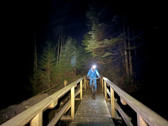 Due to the private property problems I insisted for us to start in the dark (to not get caught on the way in) even if I didn’t have the work commitment in the afternoon, so this wasn’t a difficult sell after all. Matt agreed to meet in front of Quarry Road’s gate at 4:40 am and we would have more than 2 hours of head-lamp time. This meant the entire biking section would be done in the pitch dark, and I knew from past experience that the regular hiker’s head-lamps weren’t likely to be bright enough for the speedy ride. I decided at the last minute to bring my Mt. Everest summit head-lamp that has 700 lumen, but then two days later I found out that I did not take my regular one (with spare batteries) out of the backpack. I seldom made careless mistakes like that, but guess I really made sure to have enough illumination to survive two nights up in the death zone. There were two gates to hop over and the first one was sort of difficult with the cumbersome bikes. The ride was mostly as expected, a smooth sail but with countless up-and-downs. I have already developed enough uphill muscles to not suffer on rides like this, but this was not the averaged 10-km ride in the city, and was certainly more difficult than the ride up Seymour Valley in the North Shore. We rode past the canoer’s campsite onto Widgeon Lake trail and the trail was still very ridable. Matt was promising to ride all the way to the Fools Gold’s junction and he was surely not kidding. The final 2 km had some rough sections and steep uphills that necessitated pushing the bikes, but the pushing was worthwhile. There were more flats coming, and the downhills were entirely rideable towards the end of the day. We parked the bikes right in front of two ditches that were only 100 m away from the Fools Gold’s junction. I took my time donning mountaineering boots, and then off we went into the unknowns.