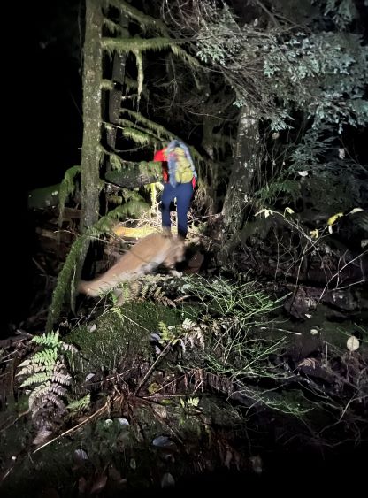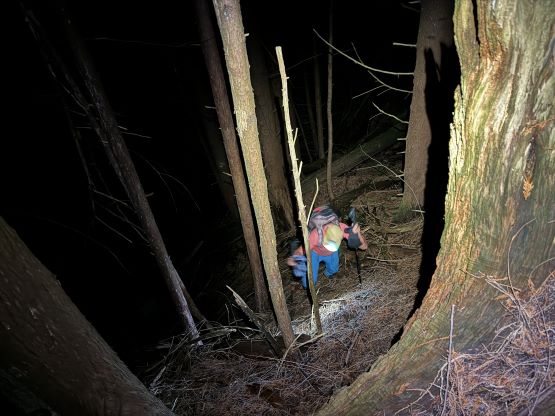 The start of the Fool’s Gold trail follows a deactivated spur down to a foot bridge crossing Widgeon Creek. This section was quite overgrown making me worry about the status of the trail further up the valley (for the access to some other peaks). Unfortunately we only used the Fool’s Gold route for this brief section so I cannot comment on the trail quality beyond the bridge. We were thankful for this log bridge as the creek would otherwise be impossible to cross without going for a swim. I then led us turning climber’s right diving into the bushes, and right off the bat we encountered jungle-like terrain. The sea-level bushwhacking reminded Matt the start of Judge Howay’s approach but we knew from Thomas’ words the bushwhacking should not be that bad at all. Thankfully the situation improved after crossing a few dry creeks and the going was mostly free of obstacles after gaining 50 m elevation. Unfortunately the open-ish forest did not last long. Once the terrain became steep we had to content with some sustained bushwhacking over all kinds of obstacles. It was possible that we didn’t pick the best route due to the limited visibility in the dark, but we could not find a significantly better line a few hours later on the descent. At around 850 m elevation we merged into a landslide path and got some brief break from the bushwhacking, but the worst was to gain the south ridge from the top of this landslide. I somehow got sucked into a band of brambles and needed a break to don gloves. I gave no shit about ruining the gloves as I could not find a better way without significant backtracking. The uncontractible 135 cm trekking poles were a major liability on this day, and so were the snowshoes that were entirely not needed. Matt and I regrouped after encountering some patchy snow on the ridge. I then immediately donned crampons as the snow was bullet proof.