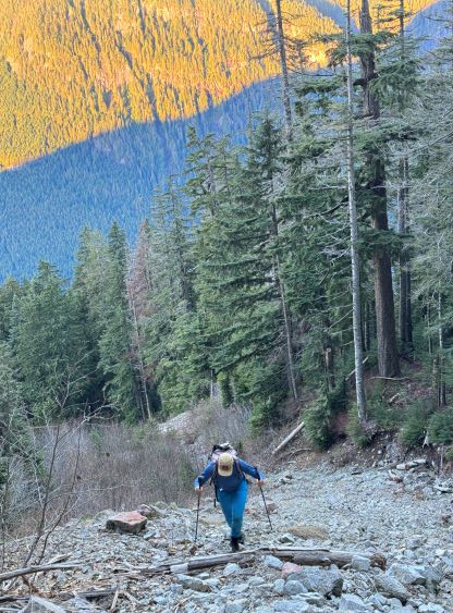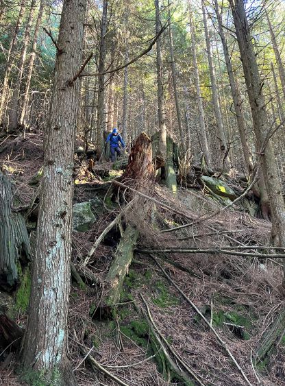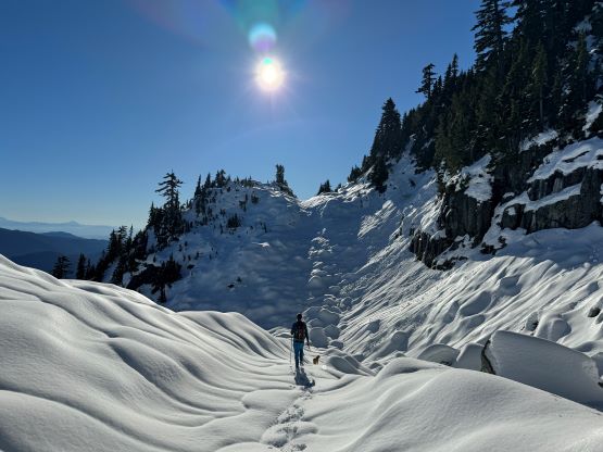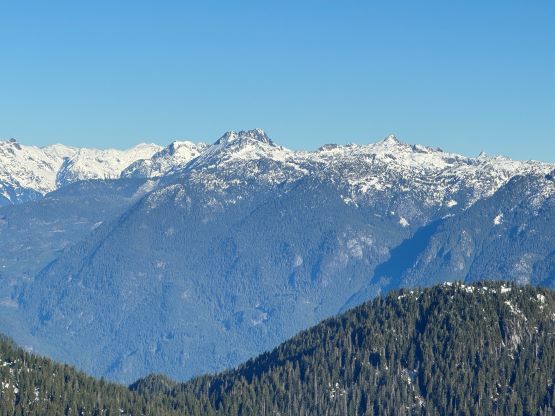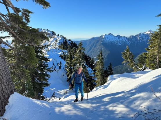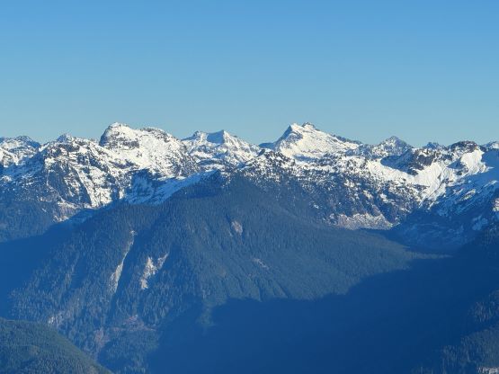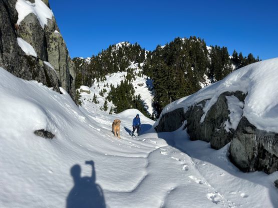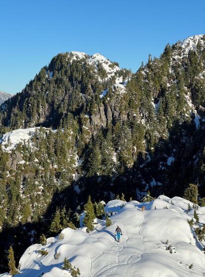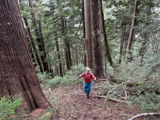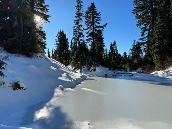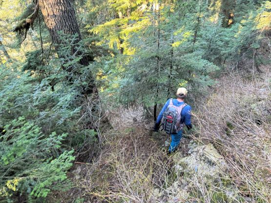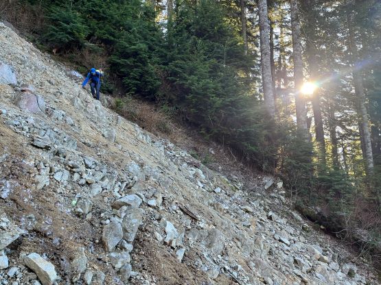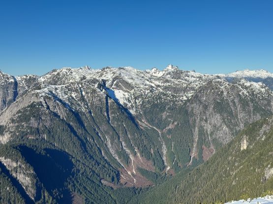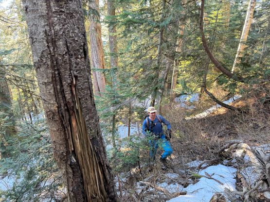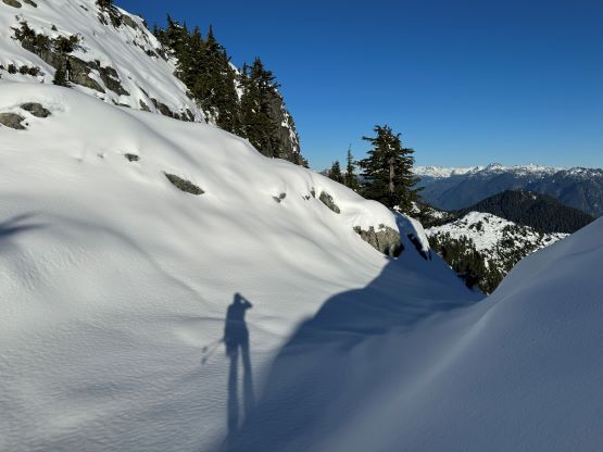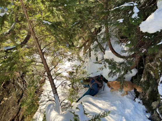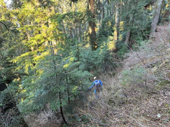 There’s no magic in going back to the central (second) summit as we had to retrace the exact steps that we just made, but then I led us down into Matt’s bypass route. There were a few steep bowls to traverse across that made me stop to take the ice axe out. The slope was on the west side and still hadn’t seen the sun rays yet so the snow was still very icy. I was tempted to be lazy as I was fairly confident on terrain like this, but a slip without an ice axe would be disastrous. Doing transitions was surely frustrating but I preferred to be safe these days. I then followed Matt’s lead bypassing the south (first) summit entirely on a bench on the east side, and Matt’s excellent sense of direction led us rejoining the route at 1150 m elevation without needing to make any unnecessary detour or backtrack. For once or twice I questioned the feasibility of this route but it all worked out despite the few interesting steps. Matt promised the 1-hour descent from the top of the south ridge down to Widgeon Creek but I thought he was kidding. Well, he was not kidding for himself, but Matt’s probably the fastest downhill bushwhacker that I had ever hiked with. This trip reminded me that I hadn’t really bushwhacked in the North Shore (I prefer and did most peaks there in winter), and secondly I hadn’t really bushwhacked with Matt yet. I normally had to wait for my partners in this kind of terrain (hence I always took hundreds of photos in the bushes), but I really struggled to keep up on the descent on this day. The bright side of having a fast partner was that I no longer needed to pull the phone out for navigation, which was also uncommon in my trips.