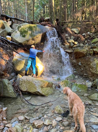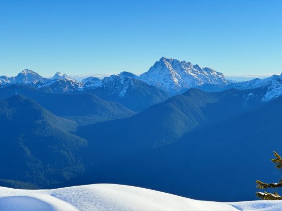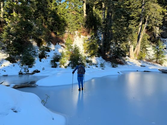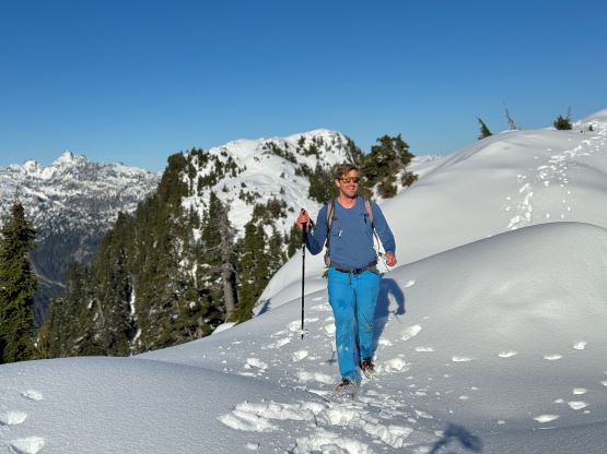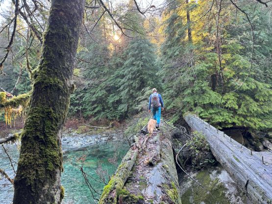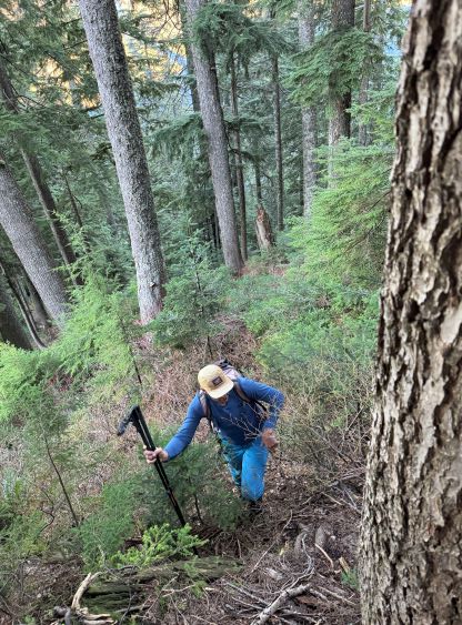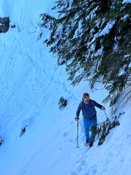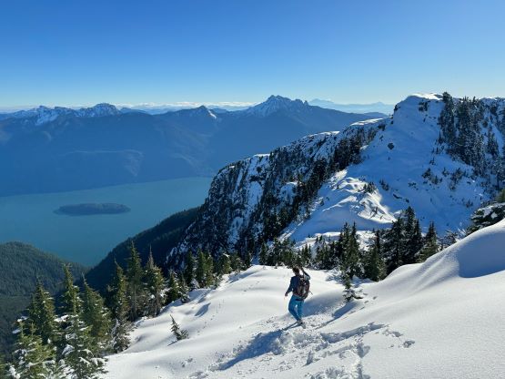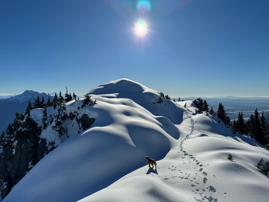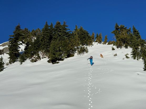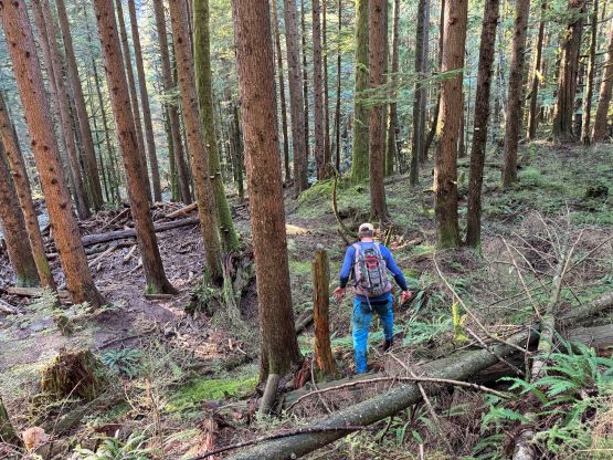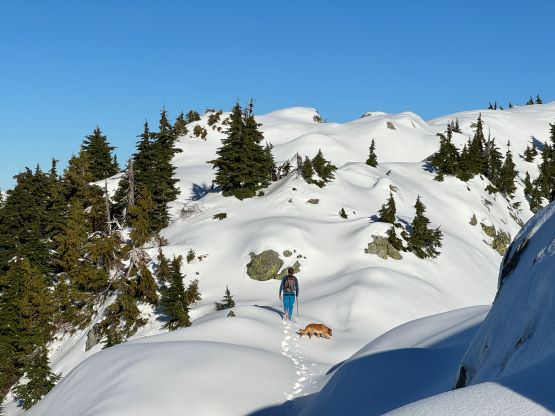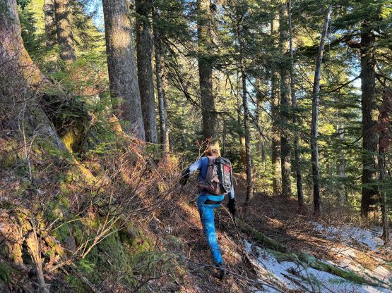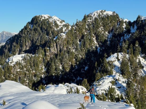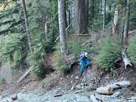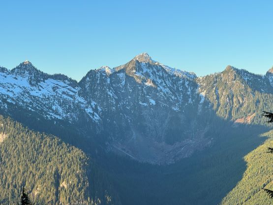 There’s no magic in going back to the central (second) summit as we had to retrace the exact steps that we just made, but then I led us down into Matt’s bypass route. There were a few steep bowls to traverse across that made me stop to take the ice axe out. The slope was on the west side and still hadn’t seen the sun rays yet so the snow was still very icy. I was tempted to be lazy as I was fairly confident on terrain like this, but a slip without an ice axe would be disastrous. Doing transitions was surely frustrating but I preferred to be safe these days. I then followed Matt’s lead bypassing the south (first) summit entirely on a bench on the east side, and Matt’s excellent sense of direction led us rejoining the route at 1150 m elevation without needing to make any unnecessary detour or backtrack. For once or twice I questioned the feasibility of this route but it all worked out despite the few interesting steps. Matt promised the 1-hour descent from the top of the south ridge down to Widgeon Creek but I thought he was kidding. Well, he was not kidding for himself, but Matt’s probably the fastest downhill bushwhacker that I had ever hiked with. This trip reminded me that I hadn’t really bushwhacked in the North Shore (I prefer and did most peaks there in winter), and secondly I hadn’t really bushwhacked with Matt yet. I normally had to wait for my partners in this kind of terrain (hence I always took hundreds of photos in the bushes), but I really struggled to keep up on the descent on this day. The bright side of having a fast partner was that I no longer needed to pull the phone out for navigation, which was also uncommon in my trips.