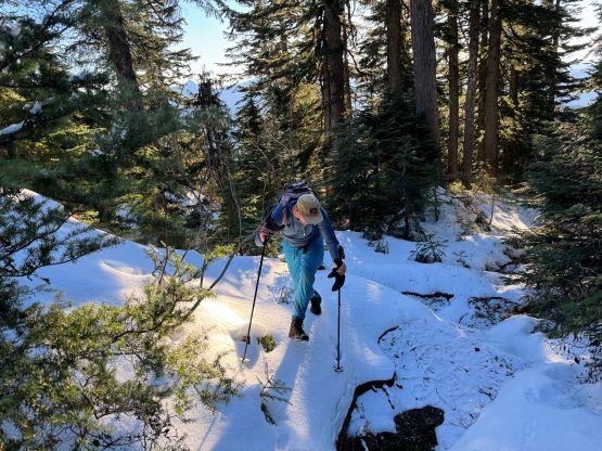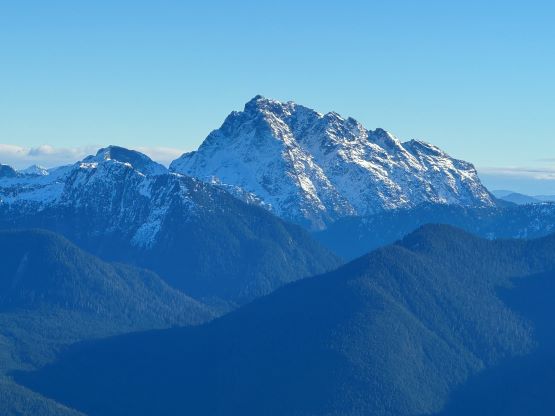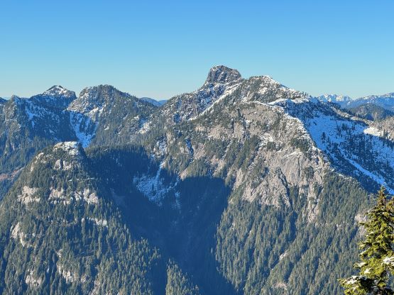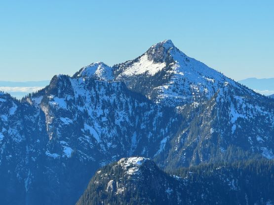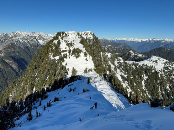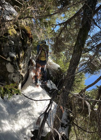 The patchy snow became continuous at 1100 m and Matt also needed to don crampons after trying really hard to go without them for about half an hour. There were two ways to tackle the first of the three summits on the south ridge and we picked the up-and-over option. We were treated with some incredible views into some seldom-seen country, but Matt found a better way around this first summit a couple hours later. The crux was to ascend or bypass the second peak. There’s a cliff band and I went for the direct attack. The scrambling felt like 4th class and required a down-sloping traverse followed by some vege-belay over death exposure. I thought the difficulty would ease after this initial step, but then I encountered a secondary (more difficult) step that really made me struggle. I ended up hauling myself up using one ice tool’s pick and one not-so-great branch. Matt was already seeking some alternative solutions on the west side so he did not see this secondary step, but nevertheless we grouped a while later below the second summit. Matt’s route was not easy, but easier than mine so we would take his route on the way out.
