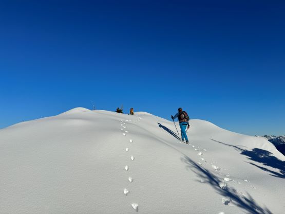 Ascending the second summit was without trouble but then we had more than 50 m to drop into the final col in front of the true summit. The descent was steep, but not difficult. The plod onto the true summit was again, rather tame but involved more up-and-downs and micro-terrain that had now become tedious. We had been moving for over 5.5 hours on full force and we were starting to get tired. Thankfully the summit was attained shortly after and we were able to linger on the summit for over half an hour. There’s even some cell reception so I made some updates on the socials. It also seemed to me that I could indeed get back home in time for work, but we needed to hurry up.