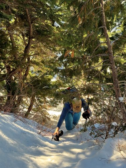 The start of the Fool’s Gold trail follows a deactivated spur down to a foot bridge crossing Widgeon Creek. This section was quite overgrown making me worry about the status of the trail further up the valley (for the access to some other peaks). Unfortunately we only used the Fool’s Gold route for this brief section so I cannot comment on the trail quality beyond the bridge. We were thankful for this log bridge as the creek would otherwise be impossible to cross without going for a swim. I then led us turning climber’s right diving into the bushes, and right off the bat we encountered jungle-like terrain. The sea-level bushwhacking reminded Matt the start of Judge Howay’s approach but we knew from Thomas’ words the bushwhacking should not be that bad at all. Thankfully the situation improved after crossing a few dry creeks and the going was mostly free of obstacles after gaining 50 m elevation. Unfortunately the open-ish forest did not last long. Once the terrain became steep we had to content with some sustained bushwhacking over all kinds of obstacles. It was possible that we didn’t pick the best route due to the limited visibility in the dark, but we could not find a significantly better line a few hours later on the descent. At around 850 m elevation we merged into a landslide path and got some brief break from the bushwhacking, but the worst was to gain the south ridge from the top of this landslide. I somehow got sucked into a band of brambles and needed a break to don gloves. I gave no shit about ruining the gloves as I could not find a better way without significant backtracking. The uncontractible 135 cm trekking poles were a major liability on this day, and so were the snowshoes that were entirely not needed. Matt and I regrouped after encountering some patchy snow on the ridge. I then immediately donned crampons as the snow was bullet proof.