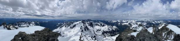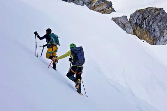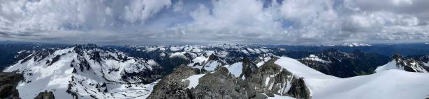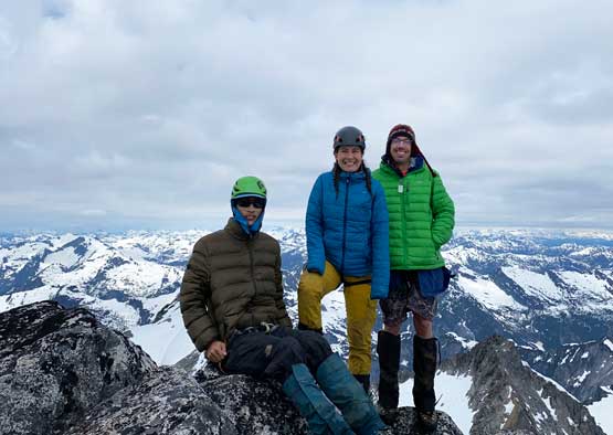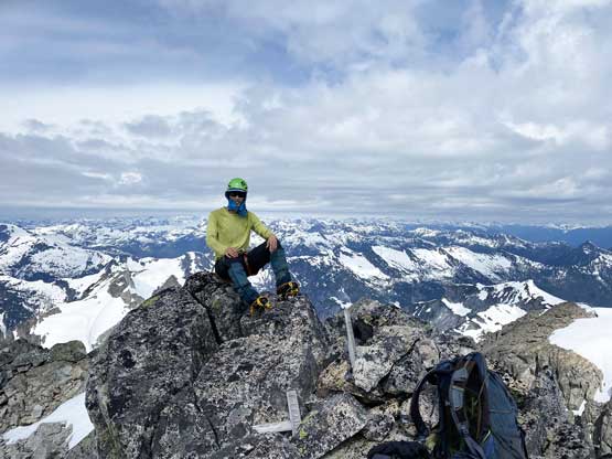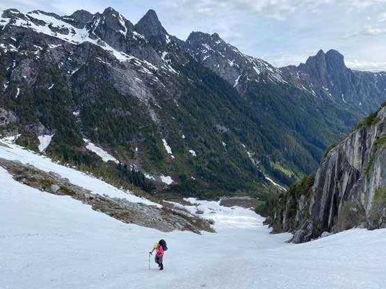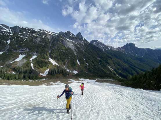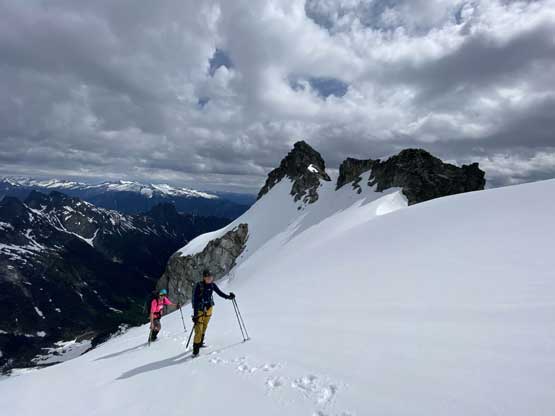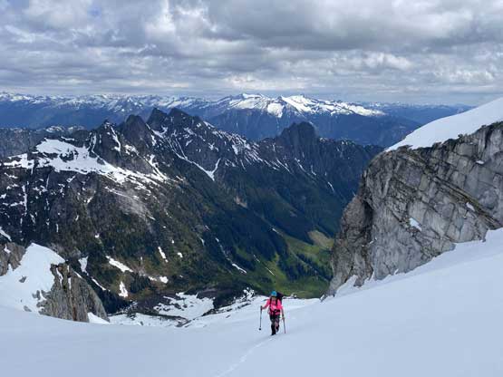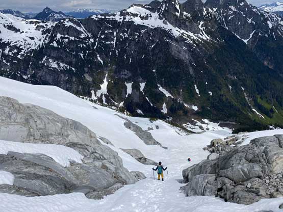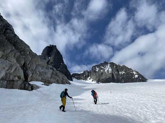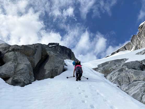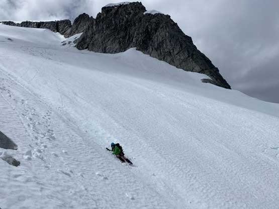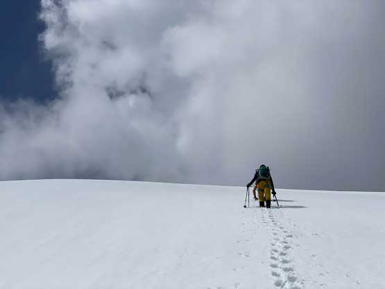 The transition from bush to snow was almost too promising to believe as we were suddenly cruising up the lower gully in perhaps 600 vertical meters per hour pace. The snow was not soft and not icy which meant we had no post-holing but also didn’t need crampons. It was such a cruise sail. The ramp to get onto the upper route was much mellower than we thought that even an ice axe wasn’t needed. We had brought two axes each, steel crampons, a rope and a picket to prepare for the worst, but it seemed like we would end up not needing anything but the ice axe. Al took over the lead charging up a steep and narrow spot to short-cut the route onto the north face glacier. We took a long break at the last rock island, ditching some gears while donning other gears. We opted to wear the harness and strap the crampons on as the glacier did appear a bit steep at least for one roll midway. Katie then led us climbing the left side of the glacier avoiding the crevasses and then I took over kicking-step up the foreshortened slope to the high col. The last snow ramp getting onto the summit was trivial and overall speaking this route was pretty damn easy with the steepest spot 40 degrees with minimal exposure, and no crevasse navigation at least at this time of a year.