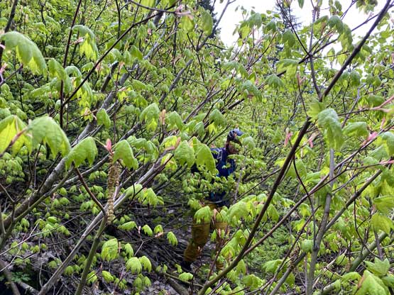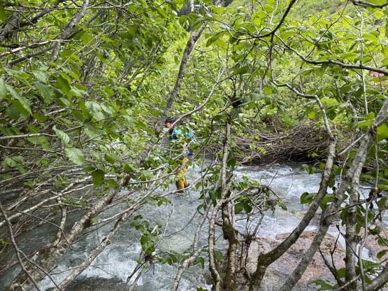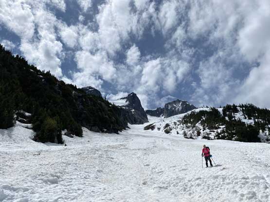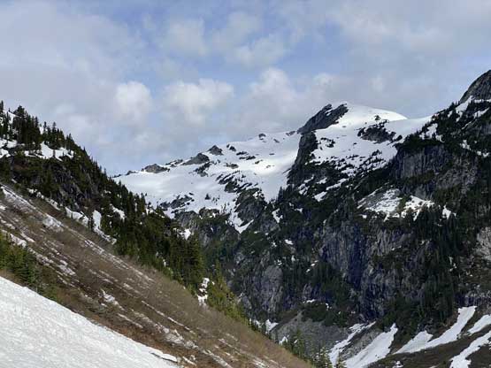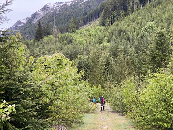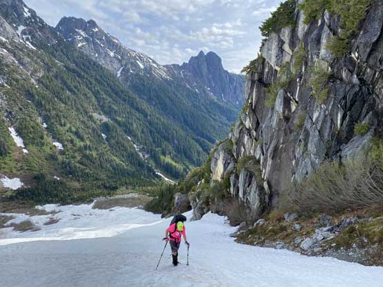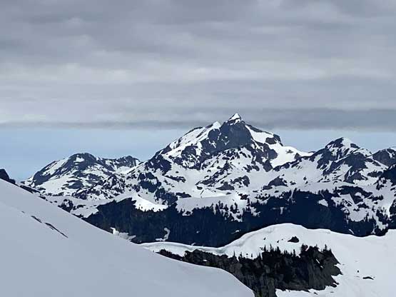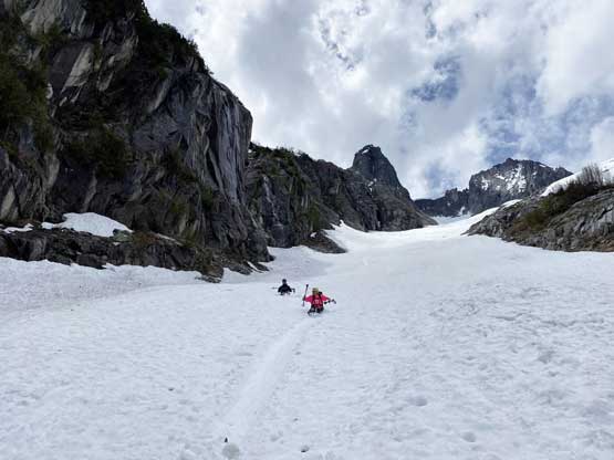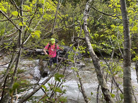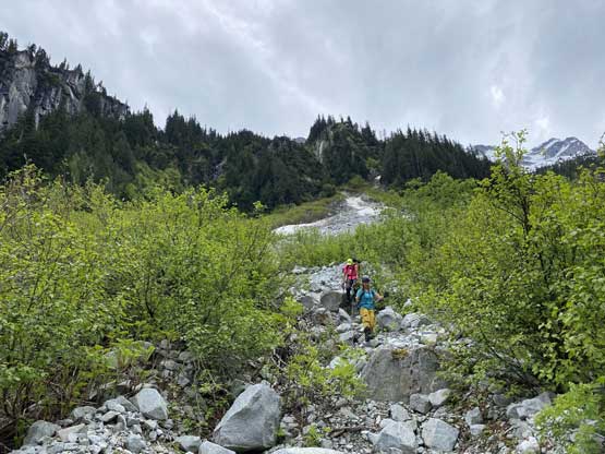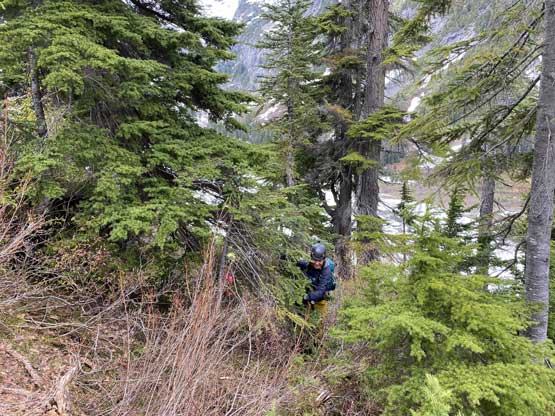We lingered for about half an hour until the wind and coldness forced us to descend. We thought about checking out the pinnacle on the NE Ridge (where Al and Katie stopped last week), but the laziness took over so we continued plunging down the glacier. We soon started glissading the glacier and in no time we were back to the rock island. Grabbing the ditched gears we continued plunging and glissading all the way down to the Trio Creek valley. I thought about tagging Medic Peak as well since we had enough time to do that, but again laziness kicked in. It turned out to be a good call skipping Medic Peak as rain started literally 10 minutes after we were back to the truck… We decided to bushwhack the south side of Trio Creek on the return for a change of taste. The worst of the bushwhack on this side of the drainage was some tight timbers mixed with some route-finding through minor cliffs, as well as a creek with dense alders that we basically just walked inside the creek, but the worst was all on down-hill direction as opposed to side-hilling. With gravity on our wide we made some pretty quick work down the worst of the bullshit (BW4 and very sustained). A few small boulder fields helped to refresh our brains. Once down to the bottom we stayed higher utilizing snow and boulder fields for as much as possible which eventually got us to pretty close to the road’s end. We waded the creek (knee deep) with some alder thrashing around the creek, and some elevation regain with a bit more alder thrashing to get back to the road. I can’t say if our return route would be a better option for the approach as pulling and thrashing up those dense timbers would be no less pain than those side-hill alders, so pick your poison and embrace the green.
