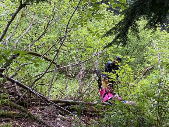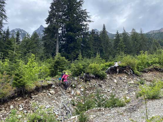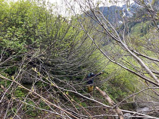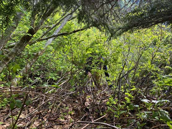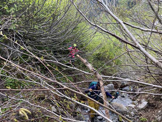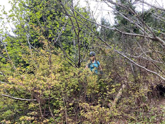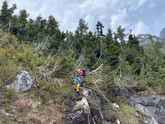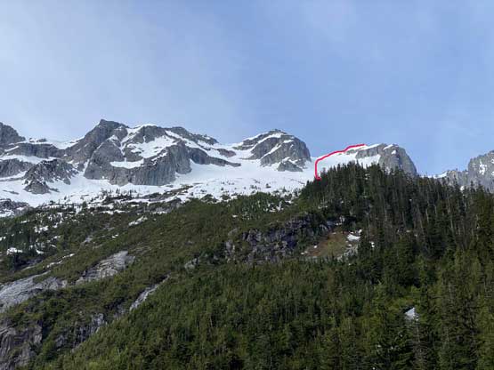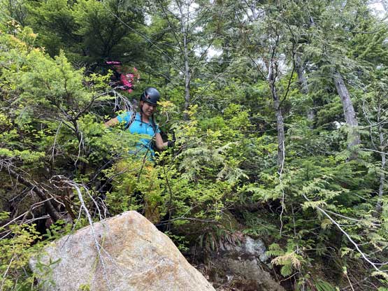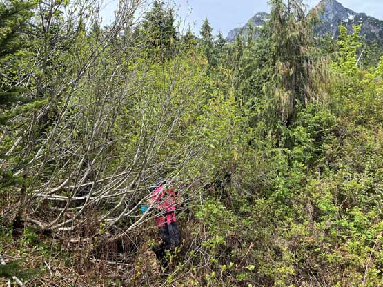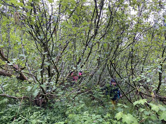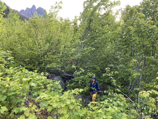 The next morning we woke up under some high clouds just as forecasted and started the going at 5:30 am, also as planned. I followed Al and Katie’s lead to the end of the road and then we made one last decision to stay on the north side of the creek to access a farther gully behind an obvious waterfall. We had some concern that the river crossing might be difficult lower down (based on their last week’s failed attempt) so I voted to bushwhack 300 vertical meters higher to cross the creek. The trade-off would be more bush as the north side looked nothing but slide alders the entire way but again, the only information we had was Google satellite images so we just hoped it wouldn’t be too bad. The start of the bushwhack was indeed not too bad as we could stay within close proximity to a band of old growth forest. We kept a diagonal traversing mode and crossed a dry creek bed. Up to this point I would rate the bushwhack a sustained “BW3” but pretty soon we would battle the real thrash. For the next 500 m horizontal distance we had to fight the side-hill slide alders for pretty much every single step thrown in some devil’s clubs and a few vertical pull-up steps. I lead the way bulldozing while giving no damn shit about my shins, pants or arms fighting as hard as I could as if I was wallowing in waist deep isothermal snow. For a while I couldn’t even see where the ground was with both feet mangled on alders. The fight improved a bit and then once entering the old growth forest beside that waterfall the going became steep, but the bushwhack eased off a lot. We also began to encounter snow, which also helped. The creek crossing was pretty trivial at this elevation but we did have to take the shoes off and wade it. Then a bit more alders and one boulder field later we were at the base of the route, almost exactly 2 hours since the bushwhack started. I would rate the bushwhack a non-stopping “BW4” with a few short stretches “BW5”, not for the faint of heart.