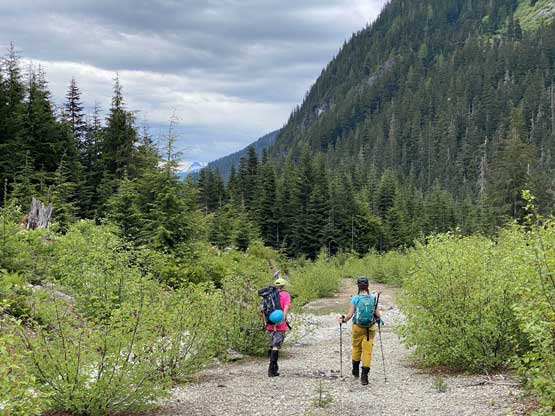 We lingered for about half an hour until the wind and coldness forced us to descend. We thought about checking out the pinnacle on the NE Ridge (where Al and Katie stopped last week), but the laziness took over so we continued plunging down the glacier. We soon started glissading the glacier and in no time we were back to the rock island. Grabbing the ditched gears we continued plunging and glissading all the way down to the Trio Creek valley. I thought about tagging Medic Peak as well since we had enough time to do that, but again laziness kicked in. It turned out to be a good call skipping Medic Peak as rain started literally 10 minutes after we were back to the truck… We decided to bushwhack the south side of Trio Creek on the return for a change of taste. The worst of the bushwhack on this side of the drainage was some tight timbers mixed with some route-finding through minor cliffs, as well as a creek with dense alders that we basically just walked inside the creek, but the worst was all on down-hill direction as opposed to side-hilling. With gravity on our wide we made some pretty quick work down the worst of the bullshit (BW4 and very sustained). A few small boulder fields helped to refresh our brains. Once down to the bottom we stayed higher utilizing snow and boulder fields for as much as possible which eventually got us to pretty close to the road’s end. We waded the creek (knee deep) with some alder thrashing around the creek, and some elevation regain with a bit more alder thrashing to get back to the road. I can’t say if our return route would be a better option for the approach as pulling and thrashing up those dense timbers would be no less pain than those side-hill alders, so pick your poison and embrace the green.