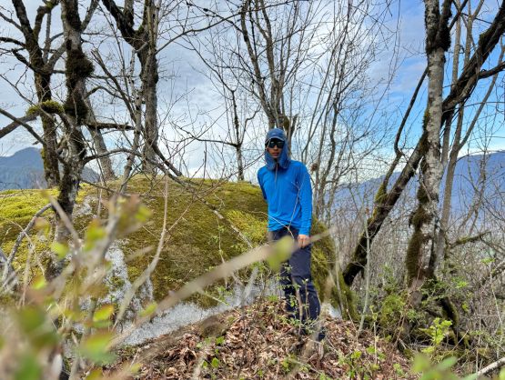 I followed the road to as far as it made sense, and then dived straight into the bushes. Right off the bat I encountered plenty of Devil’s Clubs but the density wasn’t thick enough to be problematic. There were plenty of other types of underbrush but at this time of a year they weren’t that thick yet neither. What made this route annoying and difficult is actually the amount of up-and-downs. I ended up traversing across or directly over at least 6 or 7 progressively-bigger hills. The first half of the route was quite straightforward but the bushwhacking did pick up on the second half. A few swamps were annoying, and a few hills required me to pull myself up using branches, and I had to pay close attention not to grab any of the prickly types. There were also fair amount of stinging nettles and my legs were still burning a day or two after. The summit ridge also seemed to drag on forever and trust me, there were more false summits than you would expect. I also encountered a shit ton of bear scats and other evidences of a bear hibernating or grazing in the vicinity (as warned in Caro Coco’s trip report), so I’m not sure if this is the greatest solo objective. The true summit was on a neat boulder with some intermittent views, and I stayed up there to reply some work messages.