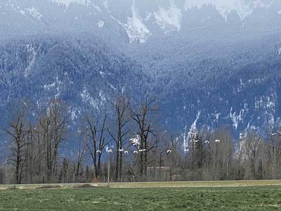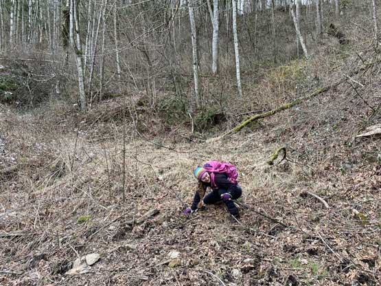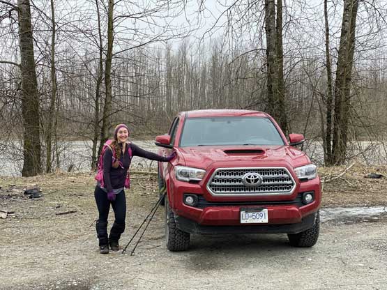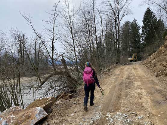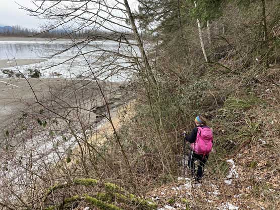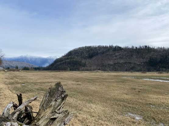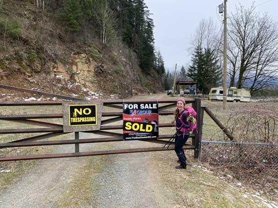 After snapping some obligatory shots we resumed the plan to make that heart-shaped loop so the descent would be down the SE flanks. This side of the terrain was surprisingly not as bad as the west side but still involved a lot of bushwhacking. About two thirds of the way down we came across an old logging road and followed it for a while. The road then did some uphill travel. Not knowing where exactly that went we bailed the road and bushwhacked steeply down to the east side farm lands. We joined the driveable road on that side and walked to the very southern end on the edge of Fraser River. The road stopped in a private property with dogs guarding but our only way home was to go through it. We gingerly walked across and thankfully the dogs didn’t bark on us. I was hoping for the road to continue but we were out of luck. The next half an hour was spent frustratingly bushwhacking across the southern tip of Hopyard Hill with a lot of up-and-downs. Traversing on the edge of the river was not an option so we must side-hill in the forest. About half way down this traverse we joined another old road that apparently came from the other side. This road brought us into another private property with gates and “no trespassing” signs but we came literally from behind, so the only way out was to go through it. I hopped over the gate but then Maria found out it’s actually not locked. The owner then came out from behind. We didn’t say anyway, just waved and continued walking back to the truck.