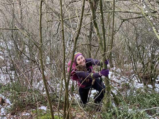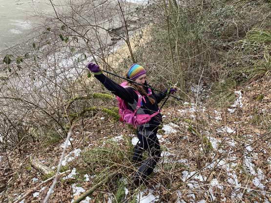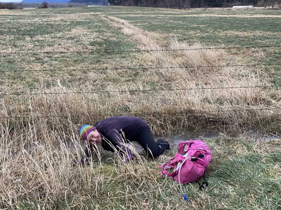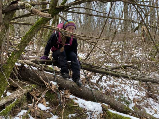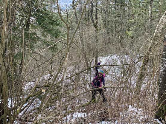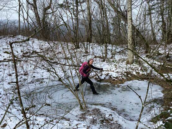 The terrain between Cemetery Hill and Hopyard Hill was entirely farm lands with numerous ditches and barbed wire fences to hop across or duck under. The farm lands were also swampy but the recent cold snap had frozen them over. The only reason we could complete this loop was the deep freeze as otherwise we would be dealing with 1km of post-holing in swamp, mud and quick sand. The ditches were not frozen though so we did have to find some creative way to hop across. I made a jump then Maria used my pole as an added grab.