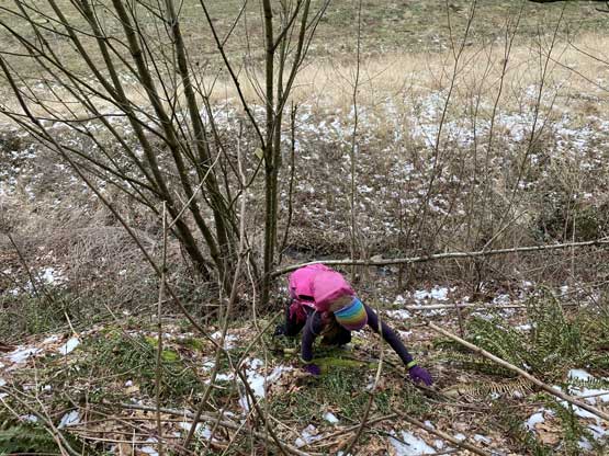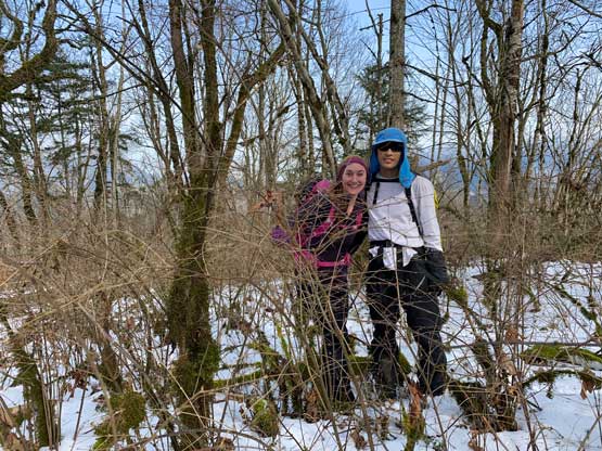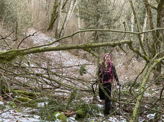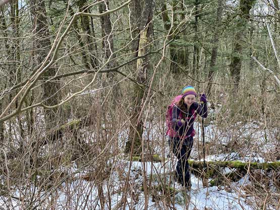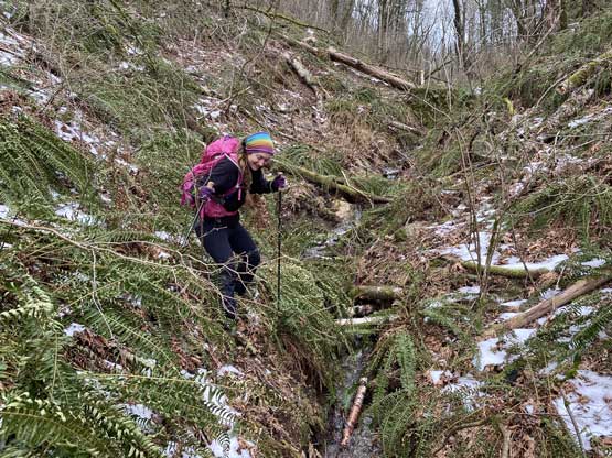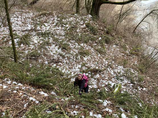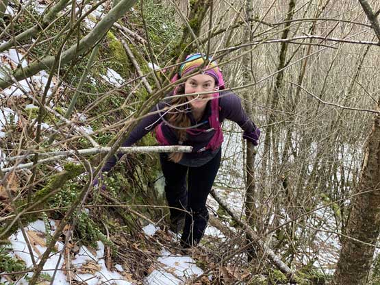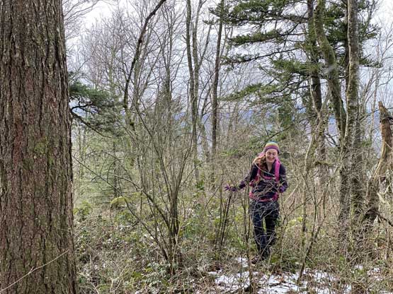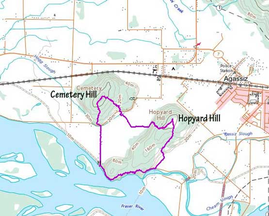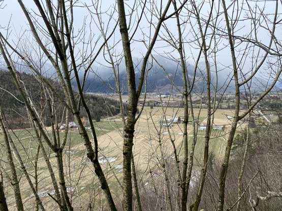 Hopyard Hill locates immediately to the west of the town of Agassiz in the middle of some farm lands. The hill is criss-crossed with old and overgrown logging roads on the lower flanks but the very top is completely covered in trees. The ascent of Hopyard Hill is the worst dumpster-dive I’ve done in Fraser Valley. This hill is slightly lower than the nearby Cemetery Hill but the ascent was steeper and bushier. Maria and I did it as a second objective on the Valentine’s Day after bagging Cemetery Hill. To bag these summits one doesn’t have to link them up but we opted to do so in order to make a heart-shaped loop track.