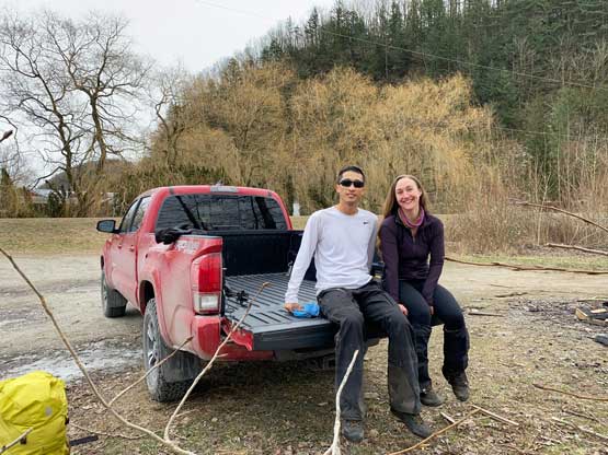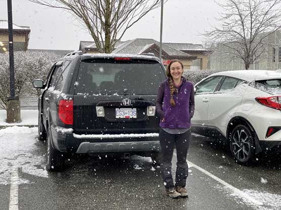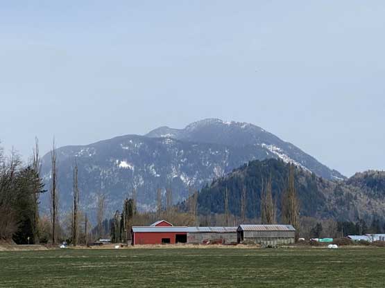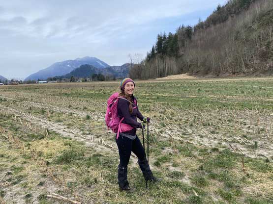 After snapping some obligatory shots we resumed the plan to make that heart-shaped loop so the descent would be down the SE flanks. This side of the terrain was surprisingly not as bad as the west side but still involved a lot of bushwhacking. About two thirds of the way down we came across an old logging road and followed it for a while. The road then did some uphill travel. Not knowing where exactly that went we bailed the road and bushwhacked steeply down to the east side farm lands. We joined the driveable road on that side and walked to the very southern end on the edge of Fraser River. The road stopped in a private property with dogs guarding but our only way home was to go through it. We gingerly walked across and thankfully the dogs didn’t bark on us. I was hoping for the road to continue but we were out of luck. The next half an hour was spent frustratingly bushwhacking across the southern tip of Hopyard Hill with a lot of up-and-downs. Traversing on the edge of the river was not an option so we must side-hill in the forest. About half way down this traverse we joined another old road that apparently came from the other side. This road brought us into another private property with gates and “no trespassing” signs but we came literally from behind, so the only way out was to go through it. I hopped over the gate but then Maria found out it’s actually not locked. The owner then came out from behind. We didn’t say anyway, just waved and continued walking back to the truck.