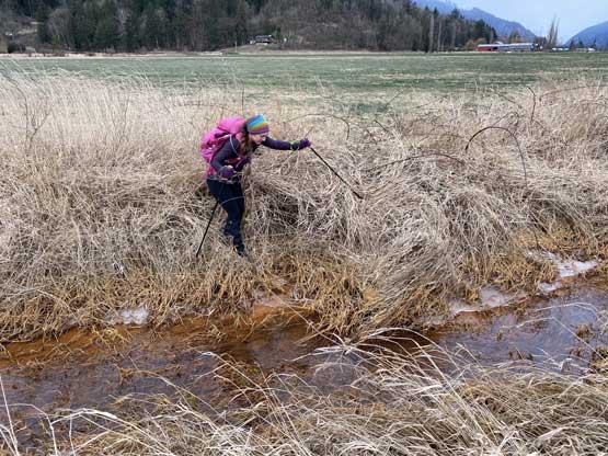 The terrain between Cemetery Hill and Hopyard Hill was entirely farm lands with numerous ditches and barbed wire fences to hop across or duck under. The farm lands were also swampy but the recent cold snap had frozen them over. The only reason we could complete this loop was the deep freeze as otherwise we would be dealing with 1km of post-holing in swamp, mud and quick sand. The ditches were not frozen though so we did have to find some creative way to hop across. I made a jump then Maria used my pole as an added grab.
