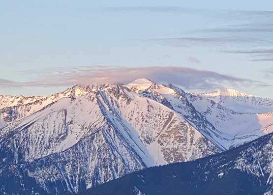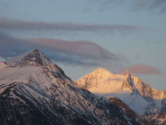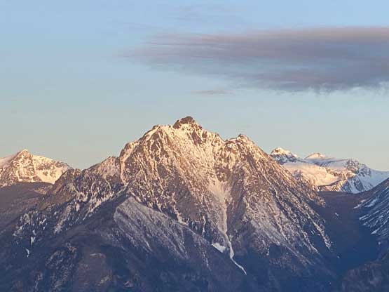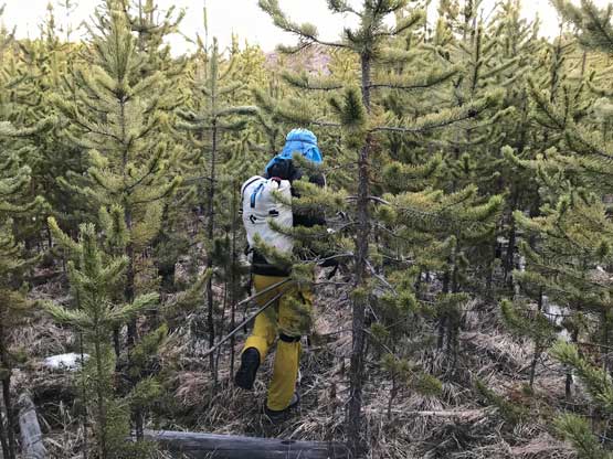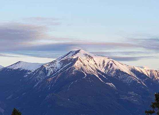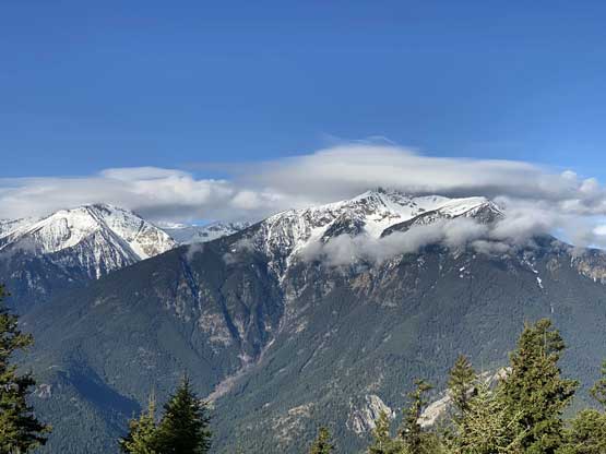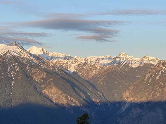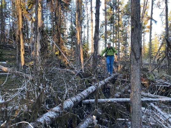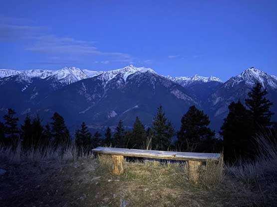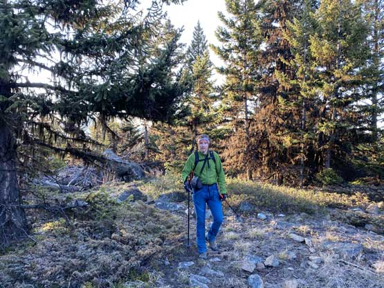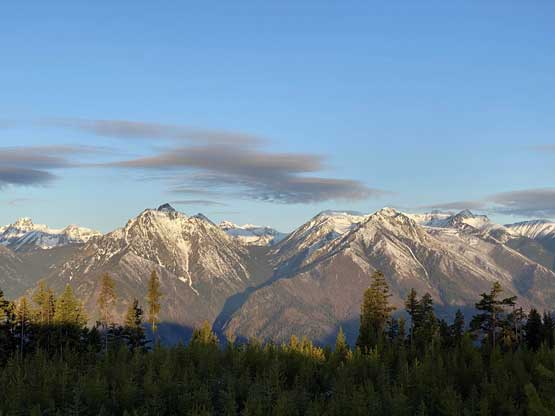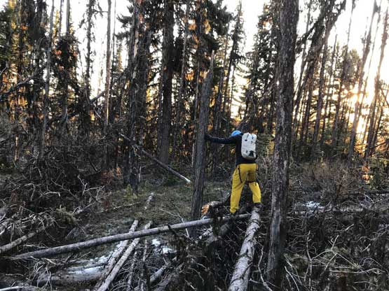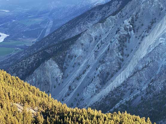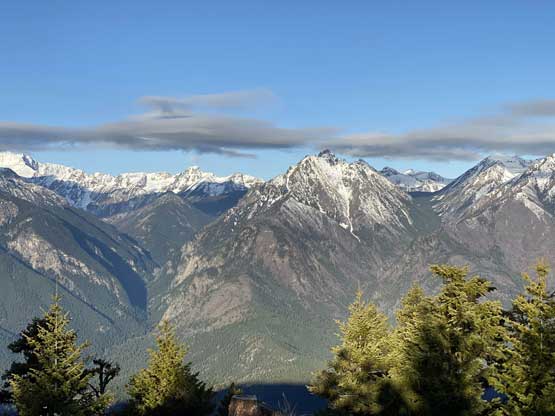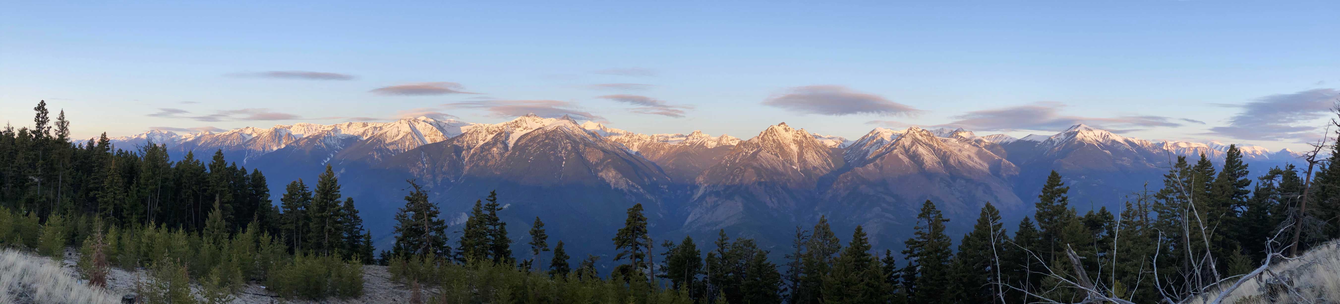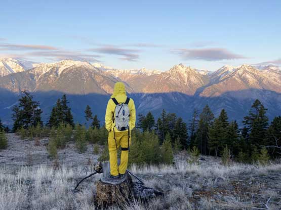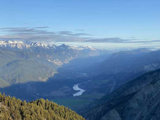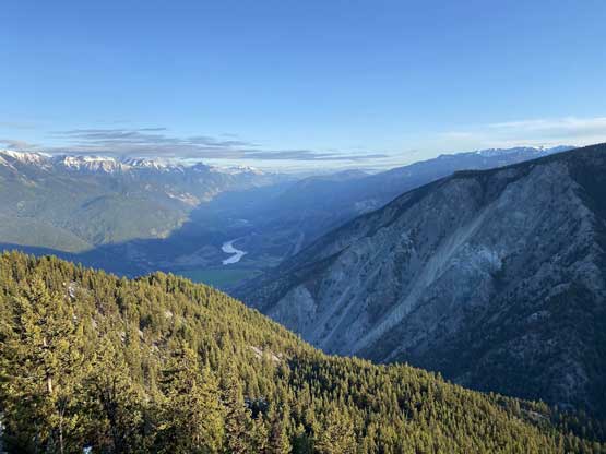 Once the peaks turned golden we resumed the bushwhack through some tight timbers into the mature forest. We were surprised to discover some dirt biking trails (with fresh tire tracks) but the trails didn’t go all the way to the summit. The last section had some unavoidable bushwhacking over dead-falls and the true summit was as expected, 100% forested with zero view. I did however, notice that on the Gaia map the northern flanks of Laluwissen Mtn. appeared pretty damn steep so opted to bushwhack north for another 5 minutes to the edge. That was quite a surprise as I honestly wasn’t expecting much. There came an incredible viewpoint with unobstructed views looking north up the Fraser Canyon towards Lillooet.