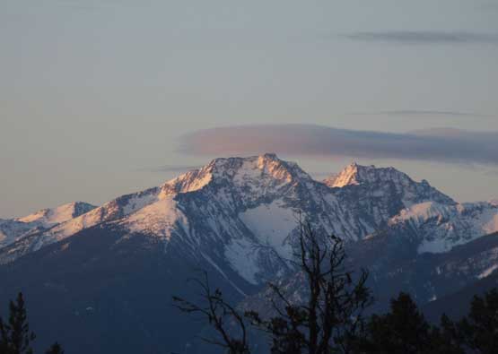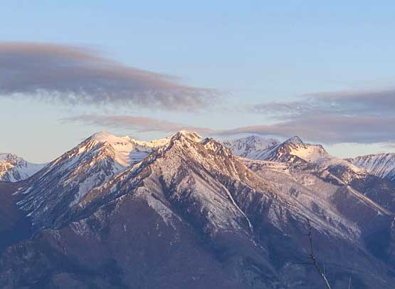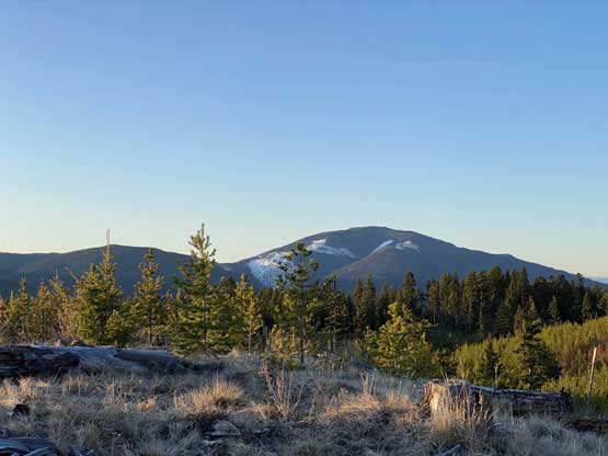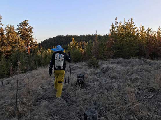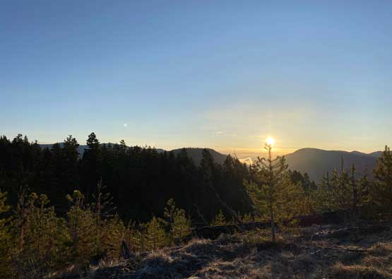 I ate two sandwiches and we were soon trudging up the boring road. It appeared that we could kept driving for at least another 2 km or so but whatever. The sky was getting brighter by 5 am and we made to the road’s end about half an hour before the official sunrise time. We continued bushwhacking in a large cutblock to an opening area and opted to wait for sunrise. It appeared that the true summit would be entirely forested so the best views were from this cutblock. It was a chilly morning but I came prepared with some winter clothing. The sunrise was nice, but not as spectacular as expected because the alpenglow wasn’t very sharp.
