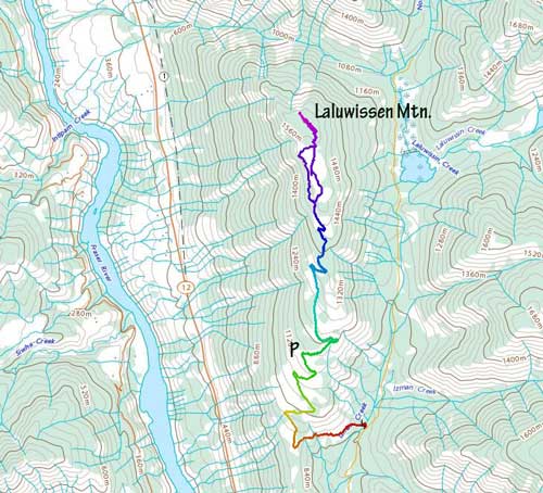 We had the usual limitation that I needed to be back home no later than 3 pm for work, so considering the long drive (3.5 hours each way) and the unknown status of the logging roads we opted to leave Vancouver at 10 pm after work. About 3 hours later we made to the start of the first (major) logging road, which climbed steeply beside Izman Creek and was rougher than expected. The second (spur) road was however, not in a bad shape. We did not expect to drive far up this spur road but other than some minor waterbars we encountered no obstacle. We passed a large group (at least 10 people) gathering and camping once topping out on the south ridge of Laluwissen Mtn. and opted to drive two more switchbacks further. The ditches were getting too big for Alex’s Subaru and the road was becoming increasingly bushy so we opted to park, at around 1150 m elevation. We estimated it would take at most 1.5 hours to reach the summit so we set the alarms at 4 am and tried to sleep. I had a lot of experience sleeping on the front seats so managed to sleep for about 2 hours but Alex got almost zero.