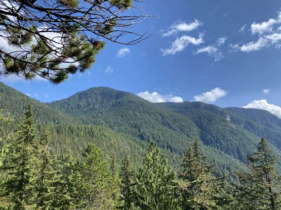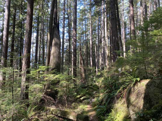 To my disappointment this section on the utility roads also had substantial amount of up-and-downs and I knew it’d feel frustrating a couple hours later on the return. The trail that goes up the northern end of Dilly Dally Loop was well signed. After traversing the forested flanks due north for a while this trail merged onto what seemed like a very old logging road. Another while later I came to a trail junction with sign of “Croker Lookout” and I took the left branch towards the lookout. The lookout offered some decent views looking down into Indian Arm. The true summit beyond the lookout was completely wooded with no view but the trail seemed to continue further down south, so I followed for another 5 minutes. The trail ended at some bluffs but the view was still fairly limited from these bluffs. I took some photos nonetheless and soon started the descent.