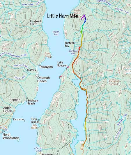 Despite the official name, this “peak” is rather just a pimple on the western flanks of “Dilly Dally Peak” that overlooks Indian Arm. A trail runs all the way to the summit but the view is very limited. There’s a “Croker Lookout” just below the summit but the true summit is completely forested. This objective is usually done as part of the “Dilly Dally Loop” that combines 5 peaks in one trip, but since the area is very accessible and close to home, I was not particularly stubborn at bagging these peaks in one trip. The hike around Buntzen Lake is decently scenic such that it’s worth to visit more than one time. Little Horn Mountain is the farthest but also the lowest of these peaks. Although the elevation gain is tame, the close-to-18 km round trip distance does make this feel like a slog, especially considering the lack of views.