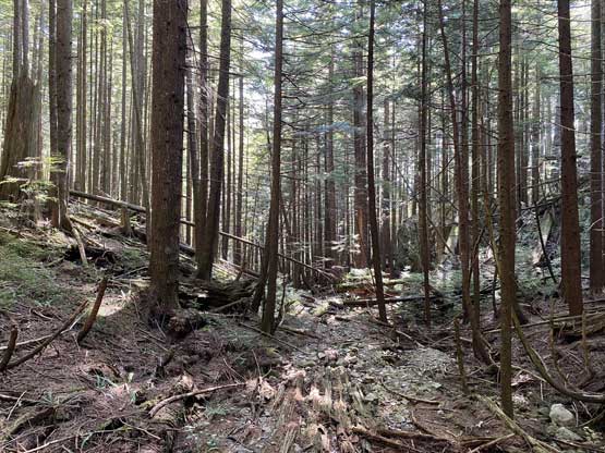 To my disappointment this section on the utility roads also had substantial amount of up-and-downs and I knew it’d feel frustrating a couple hours later on the return. The trail that goes up the northern end of Dilly Dally Loop was well signed. After traversing the forested flanks due north for a while this trail merged onto what seemed like a very old logging road. Another while later I came to a trail junction with sign of “Croker Lookout” and I took the left branch towards the lookout. The lookout offered some decent views looking down into Indian Arm. The true summit beyond the lookout was completely wooded with no view but the trail seemed to continue further down south, so I followed for another 5 minutes. The trail ended at some bluffs but the view was still fairly limited from these bluffs. I took some photos nonetheless and soon started the descent.