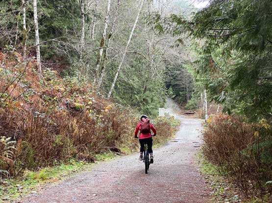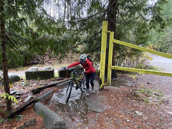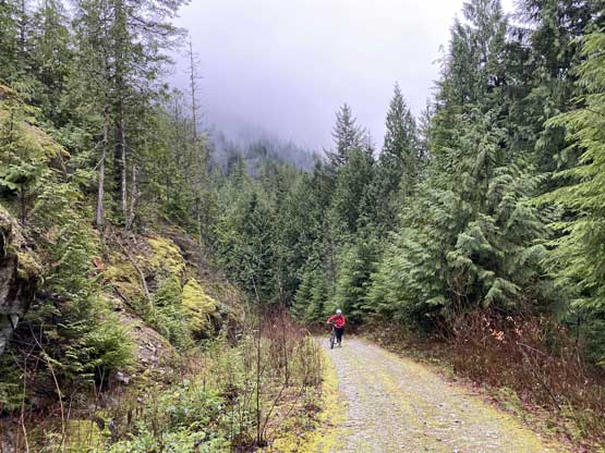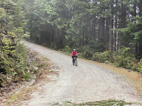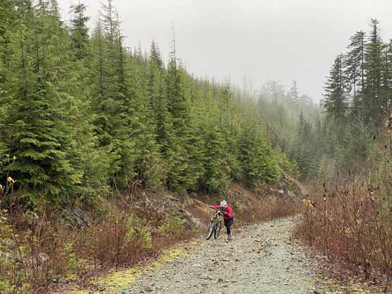 The forecast for this Friday was not brilliant but at least there’s no precipitation. The forecast showed the possible of sunshine but that turned out to be the case only for the high alpine. This “peak” was not tall enough to break through the clouds, unfortunately. I was able to convince Lily to join me on this biking trip and we left Surrey at 7 am. I was able to fit both of our bikes onto my truck’s bed. In an hour we arrived in Mission encountering no traffic delay.
