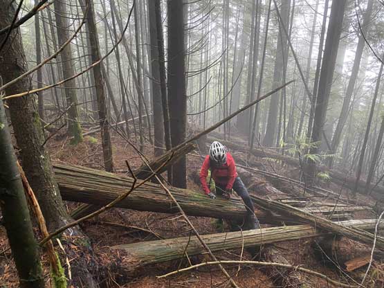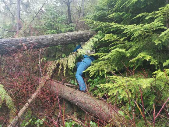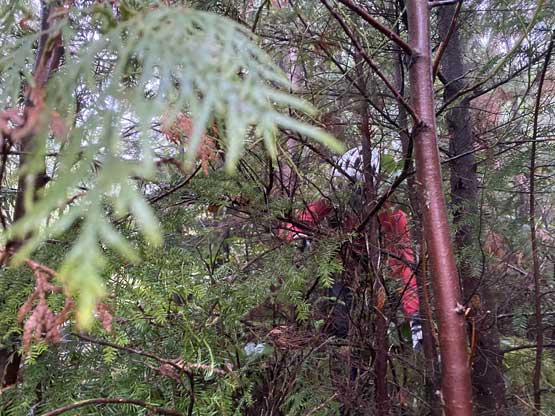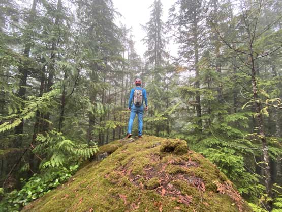 We ditched the bikes and bailed into the bush for the final 30 m gain to the true summit. The forest looked miserably and it sure was. The vegetation was soaked from the recent rain events and the bushwhacking was “BW4” until we broke out of the secondary growth mess. There were even thorny plants thrown in here and there. The true summit was located in some older growth forest so the final section was not too bad. Lily was more keen to look for mushroom while I was determined to find where the highest point was…