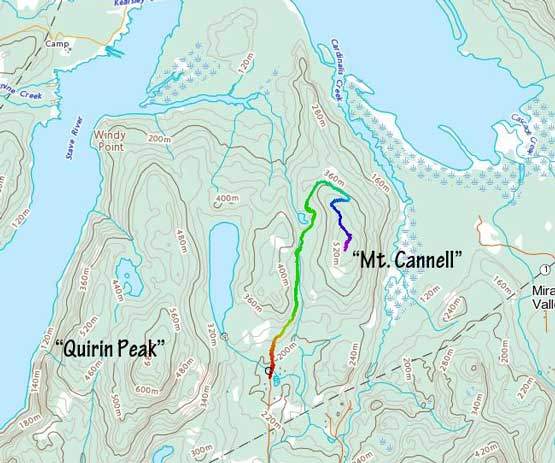 The bike ride was literally a no brainer. Between the two of us I had the better bike thank to Matt’s North Shore Bike Shop so I was able to pedal more. For some steep sections we both had to push the bikes but I was able to ride at least half of the uphill distance. The start of the ride was steep but it levelled out for a while before reaching the Hunter Trail junction. We took the right fork and had another short stretch of flat-ish ride. The spur road onto the north ridge of “Mt. Cannell” soon turned steep and rocky and stayed like that until the end.